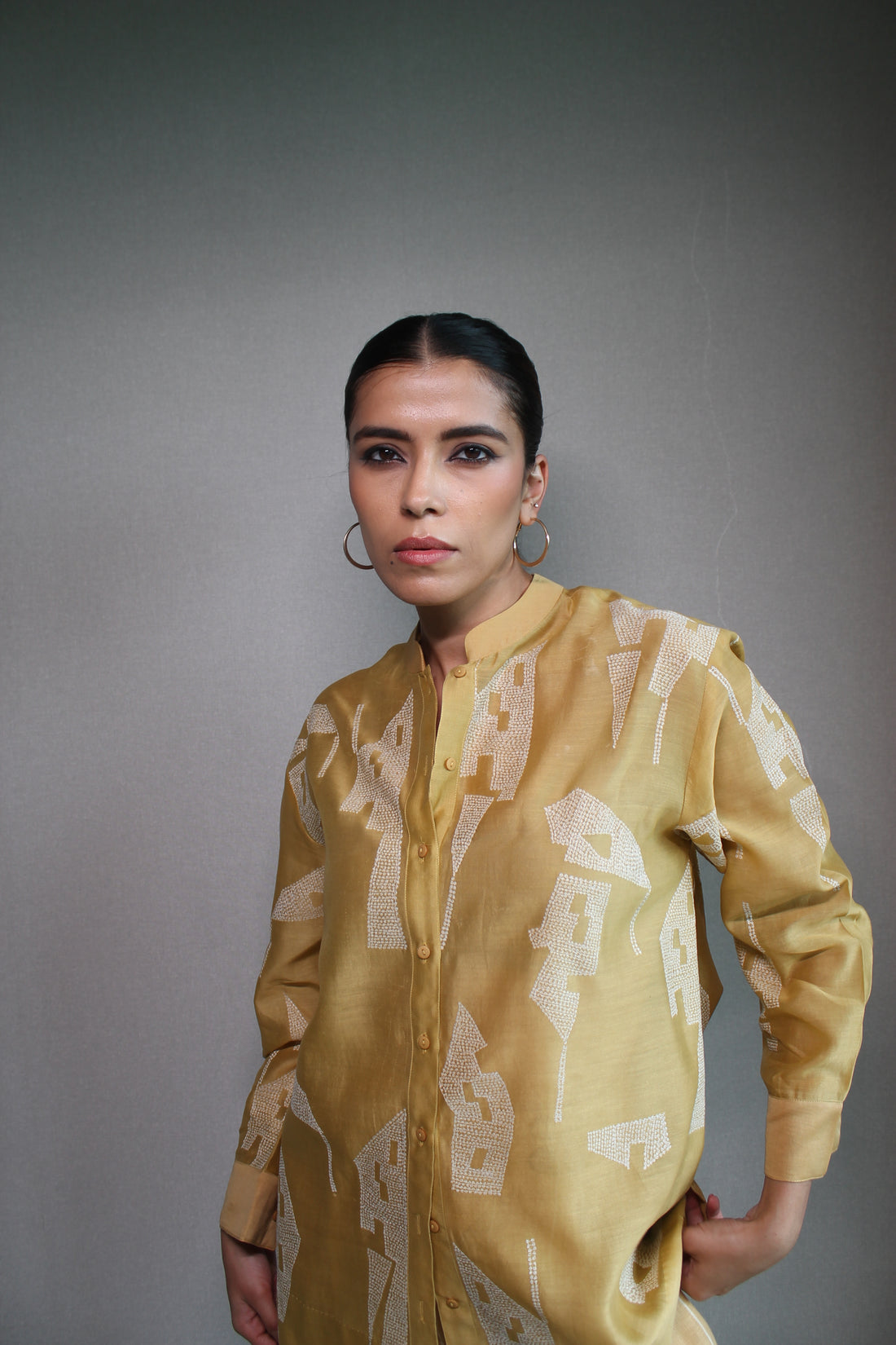 Chanderi shirt with machine embroidery and a mandarin collar.