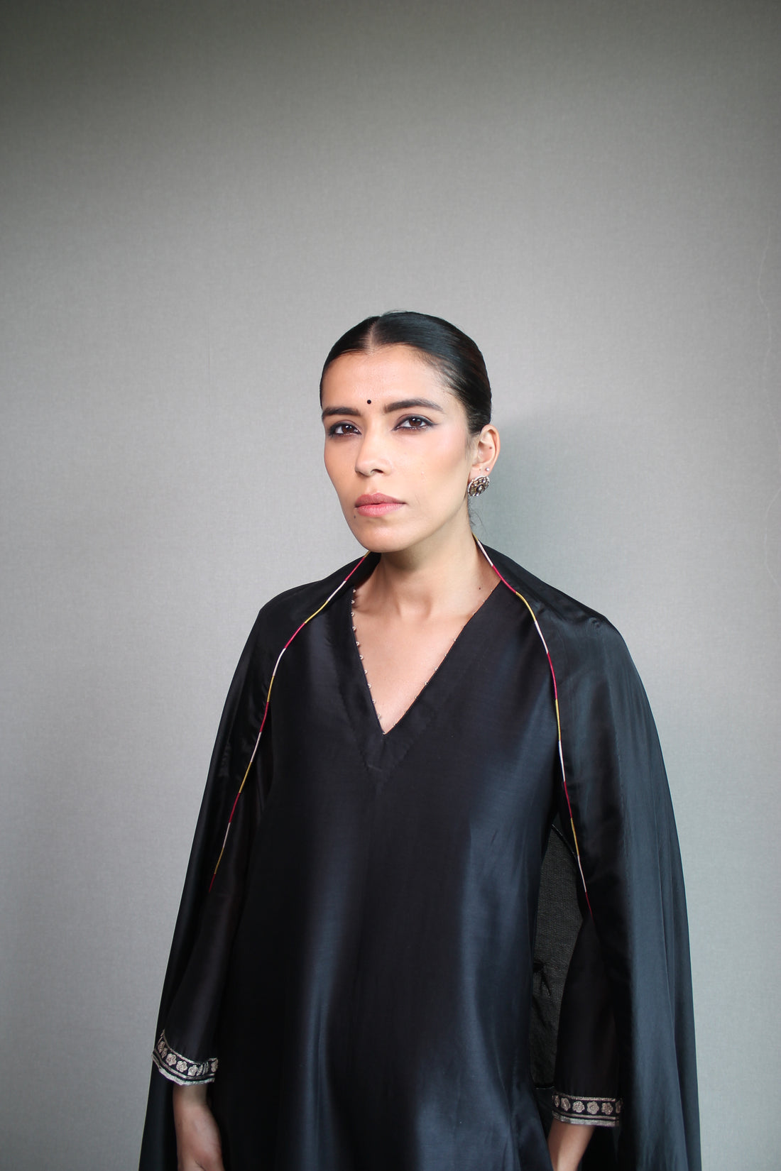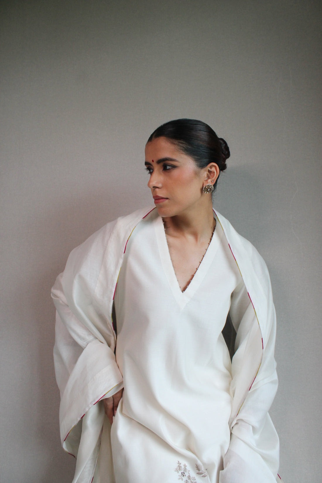 Straight cut habutai silk kurta with block print, hand embroidery, and rounded edges. Paired with...