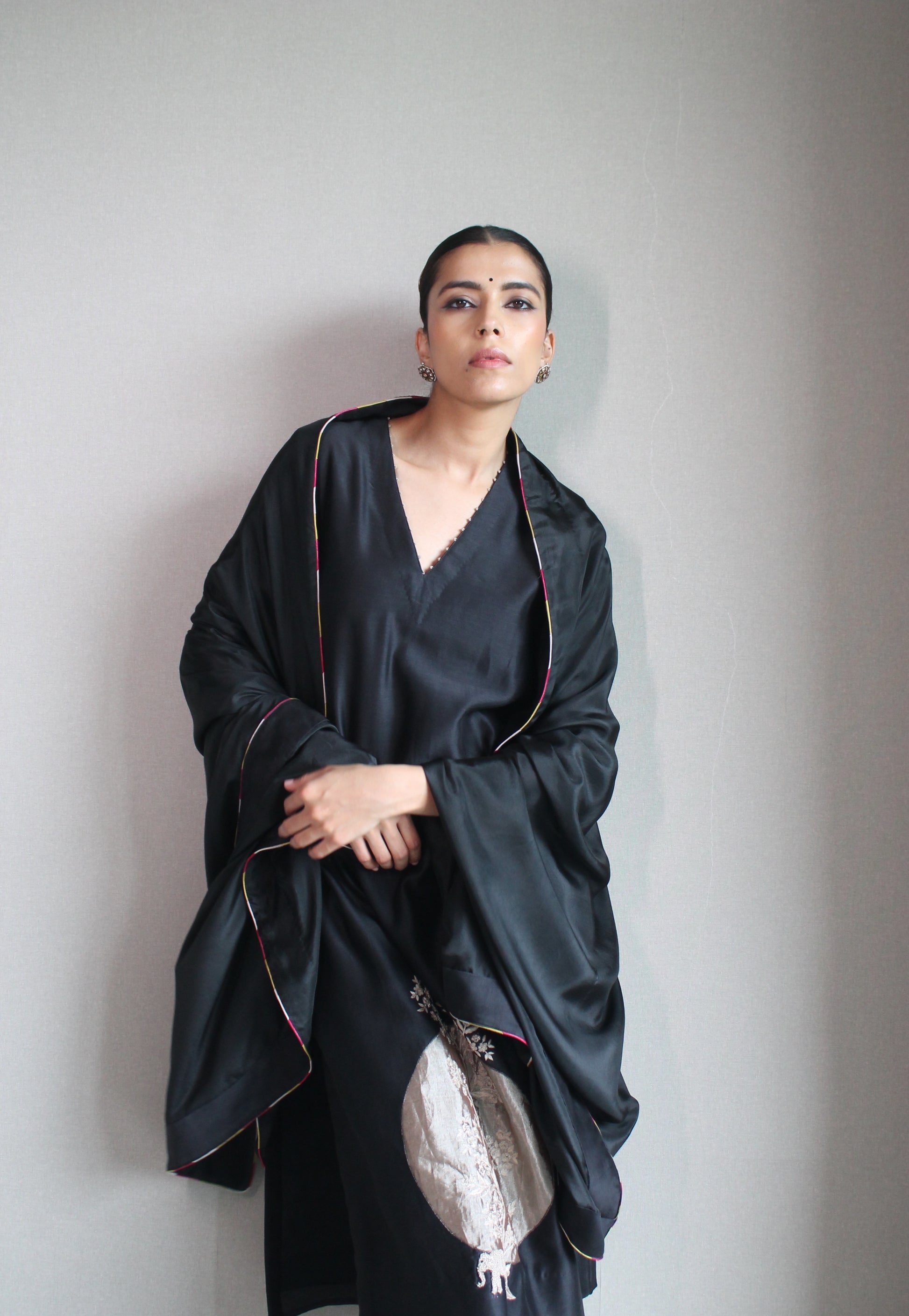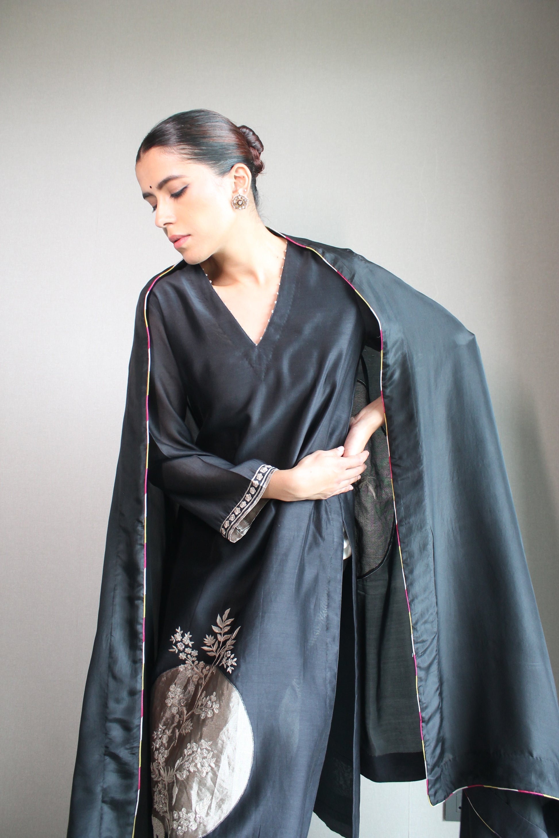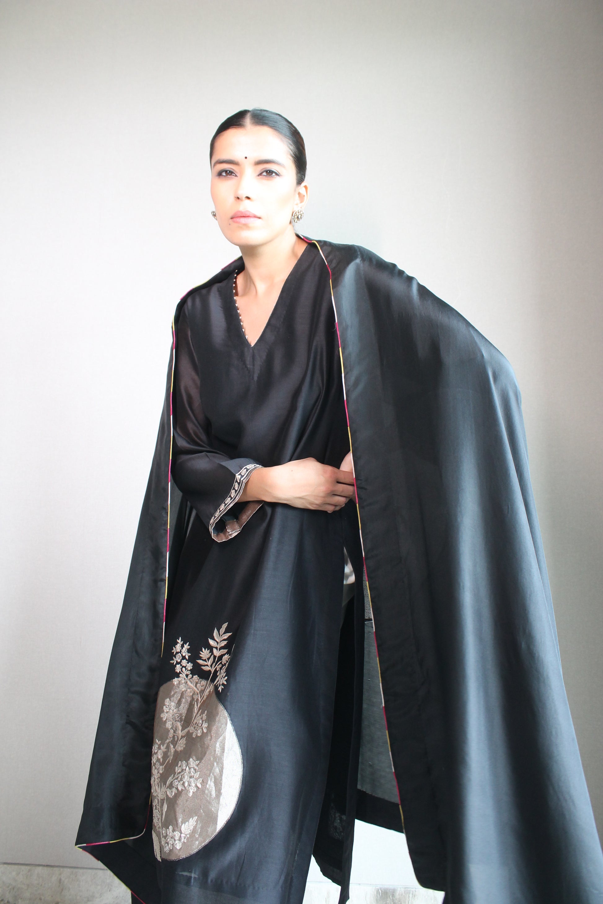 Straight cut kurta set in chanderi with hand embroidery. Paired with chanderi trousers and a silk dupatta with intricate hand embroidery.
