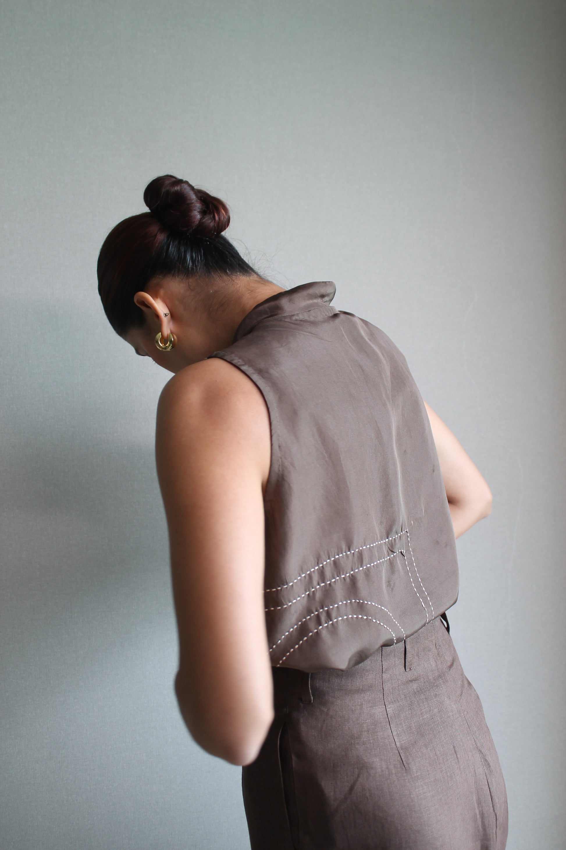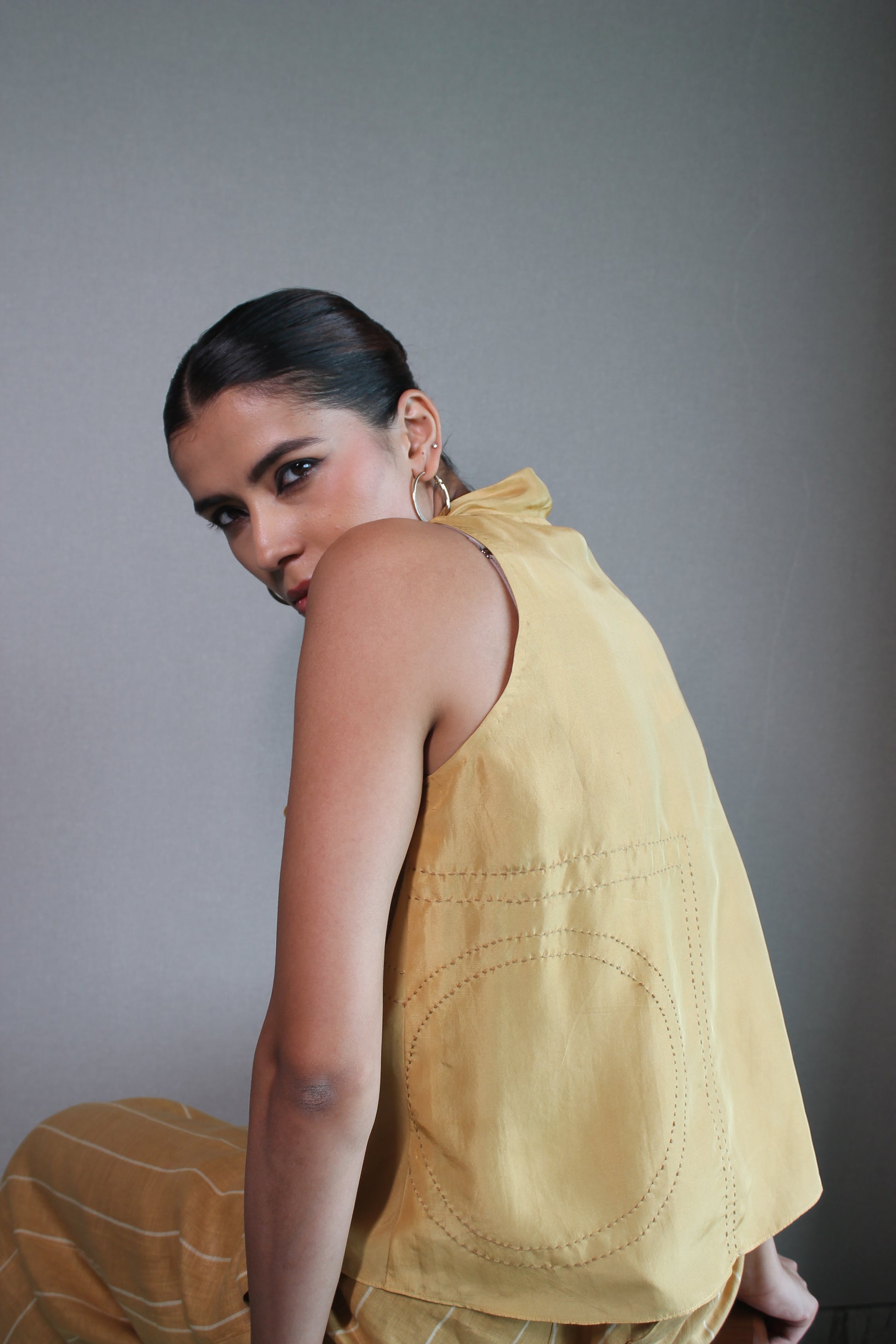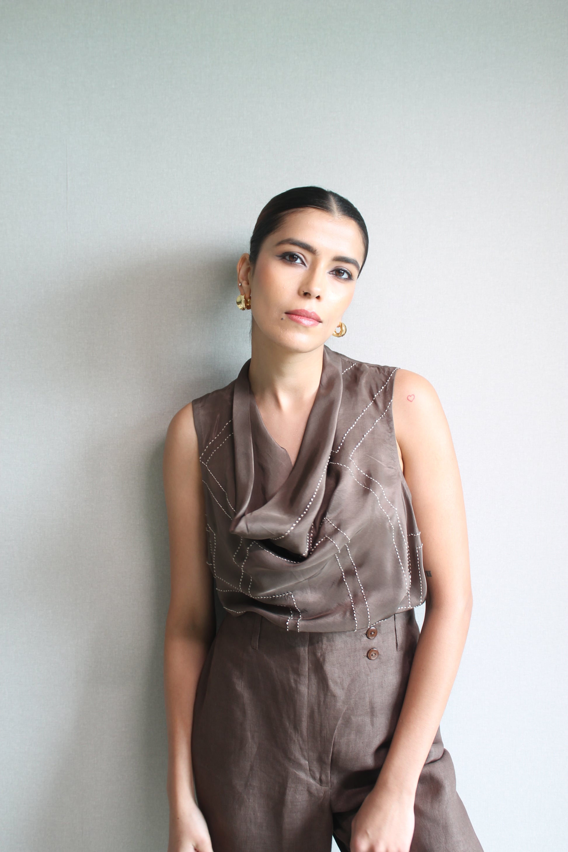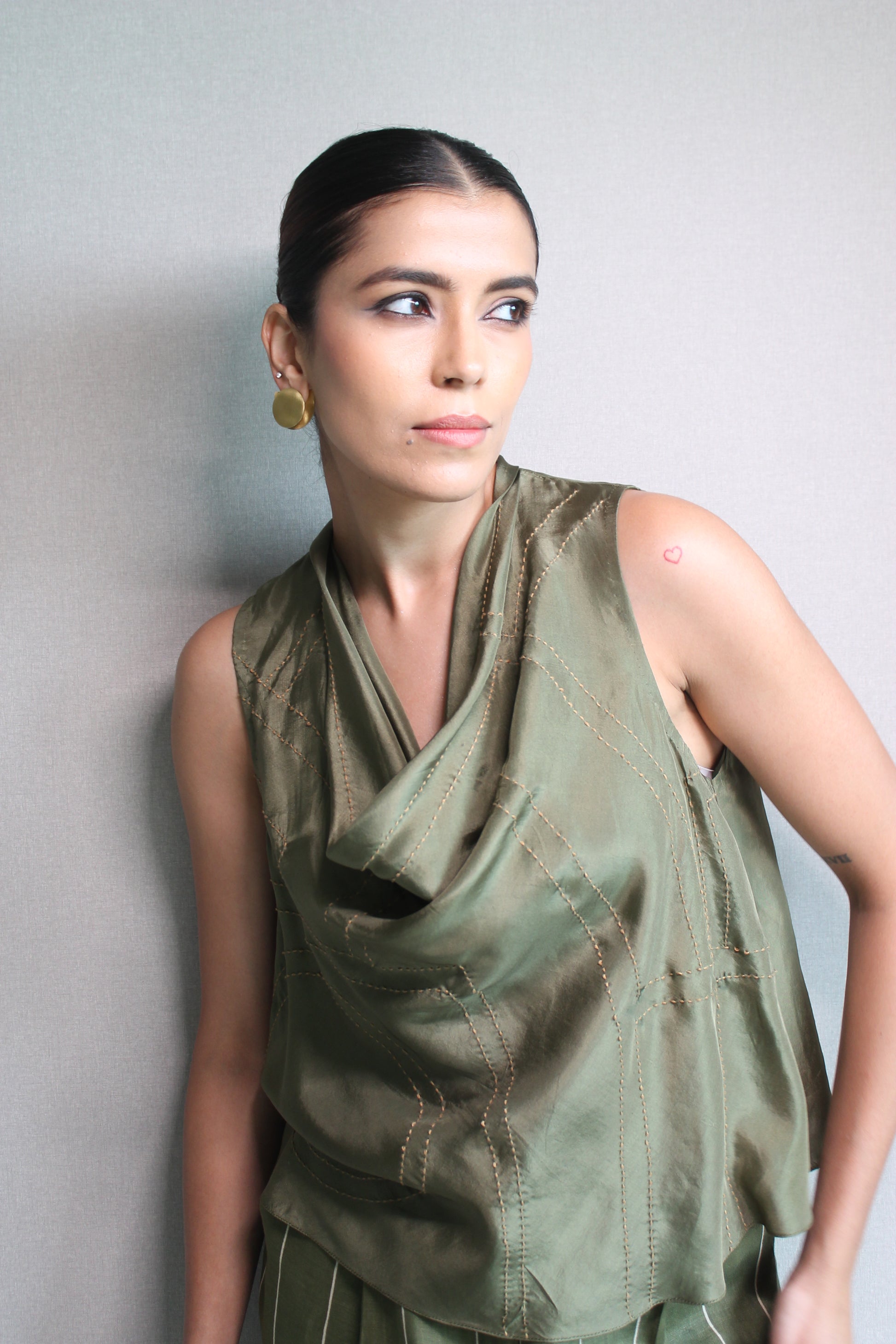 Sleeveless habutai silk top with kantha detailing and a soft cowl neck.