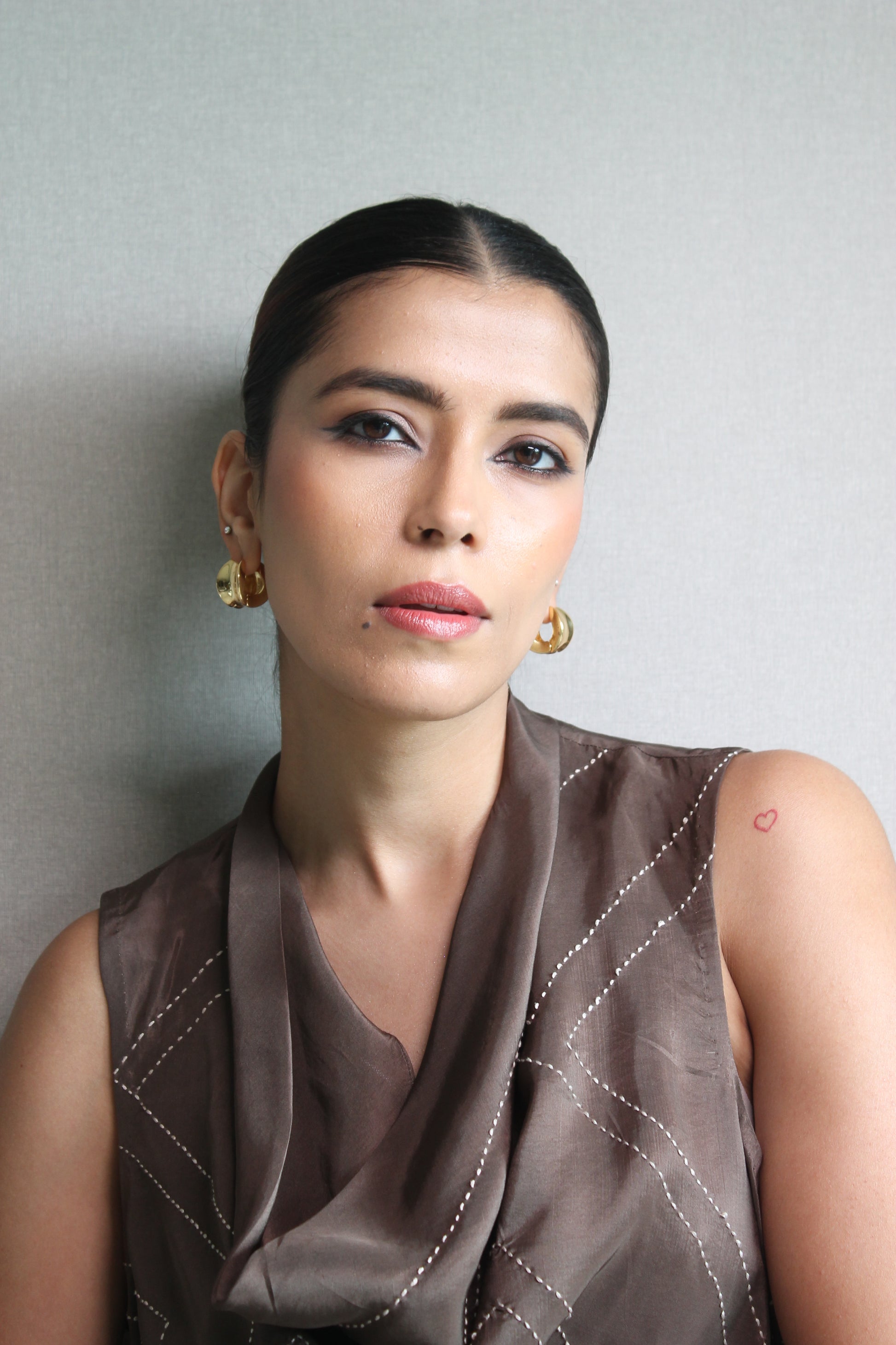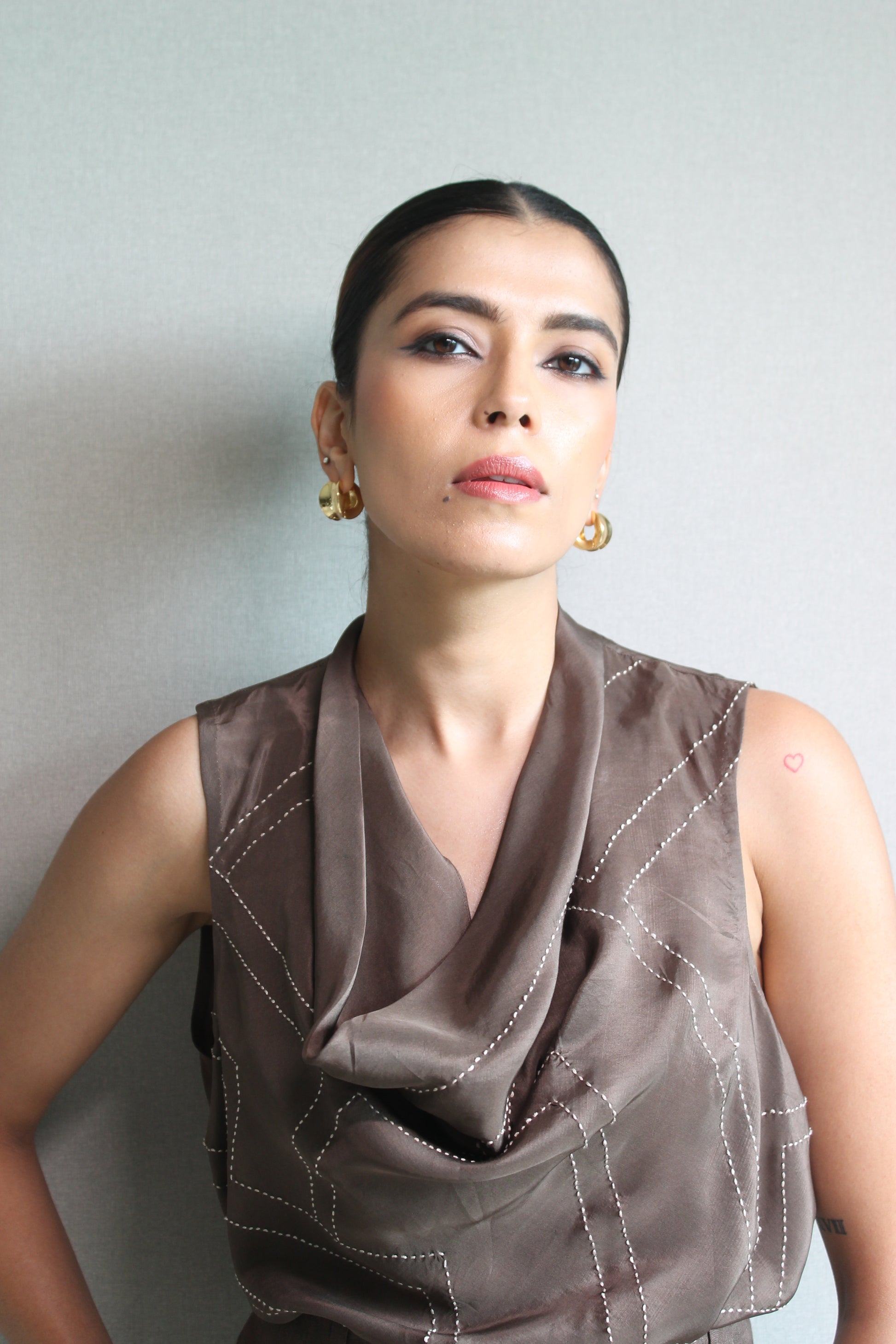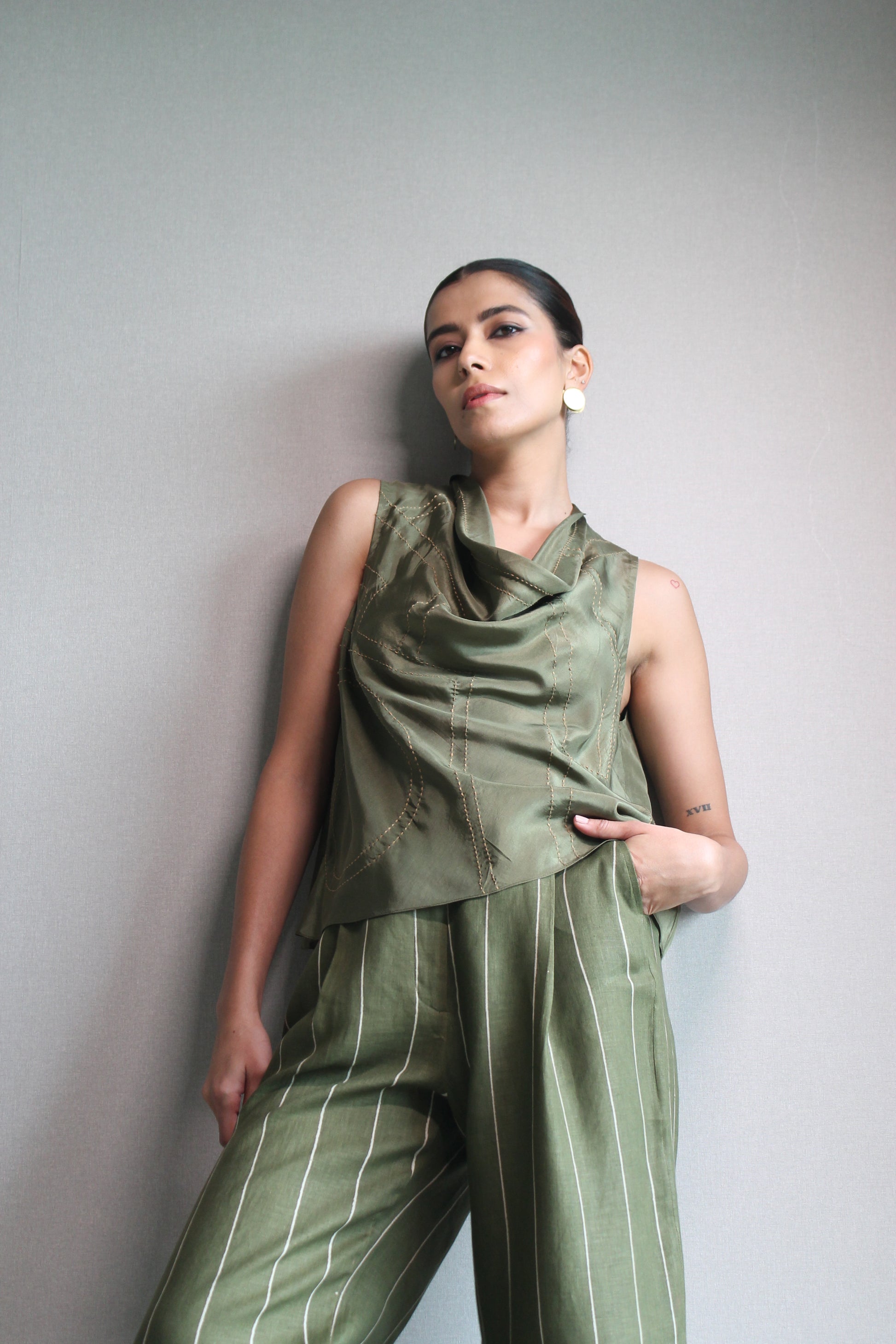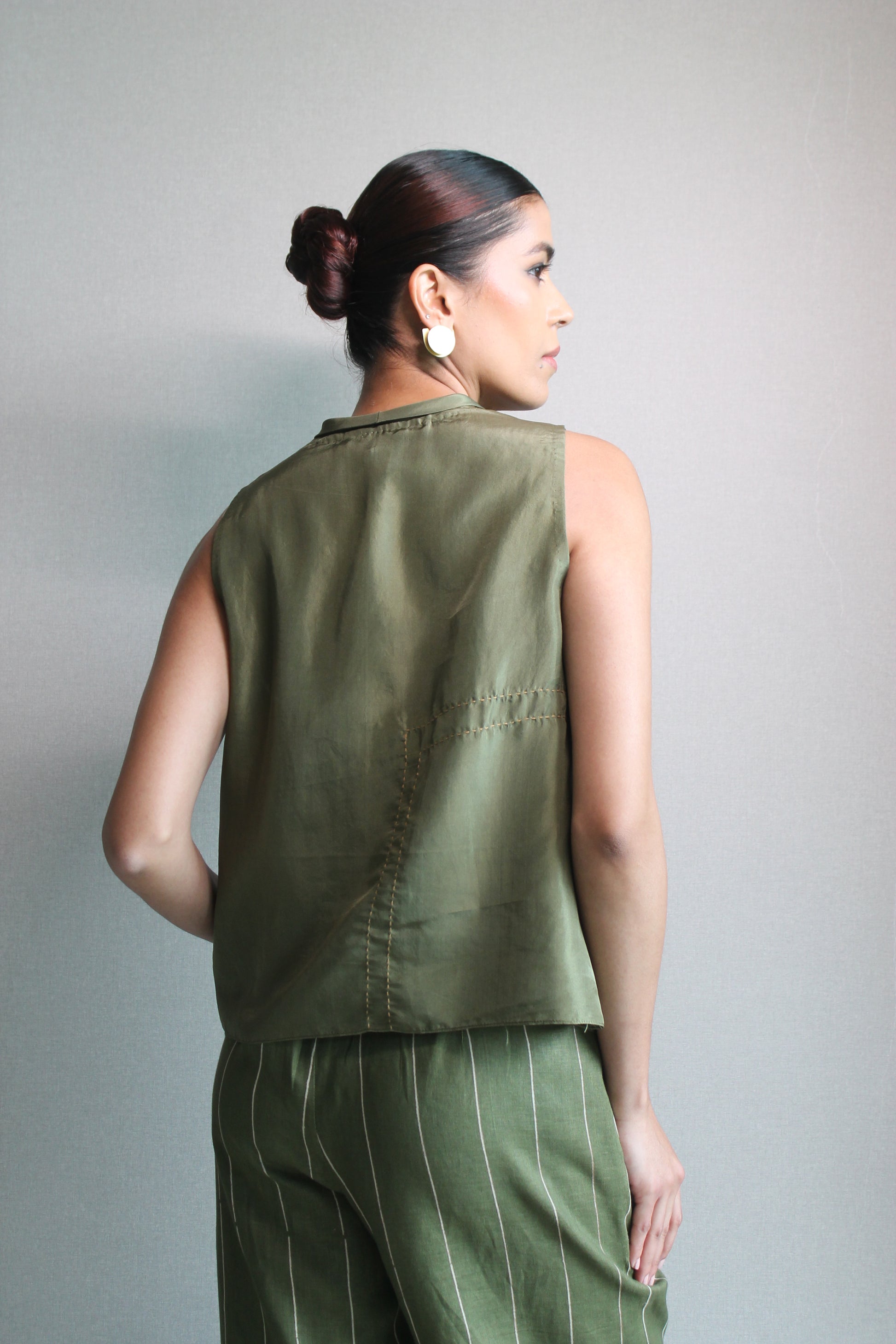 Sleeveless habutai silk top with kantha detailing and a soft cowl neck.