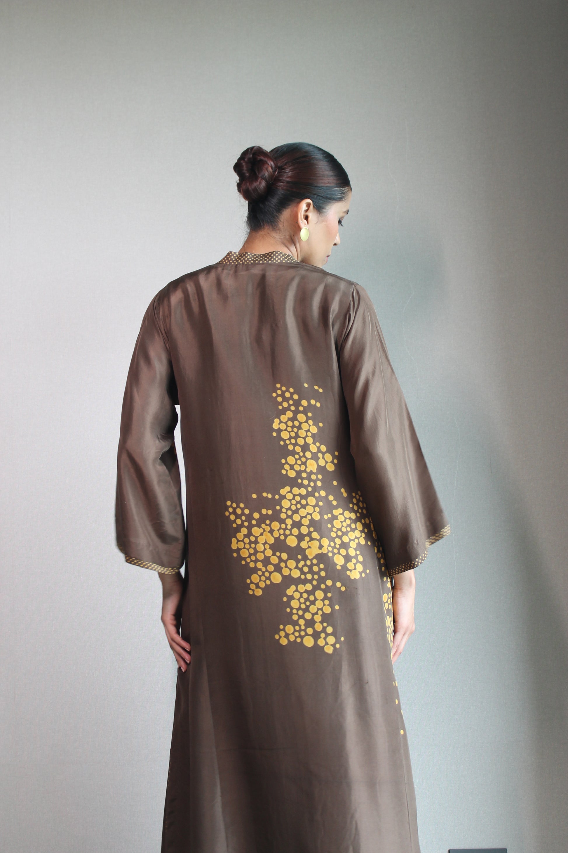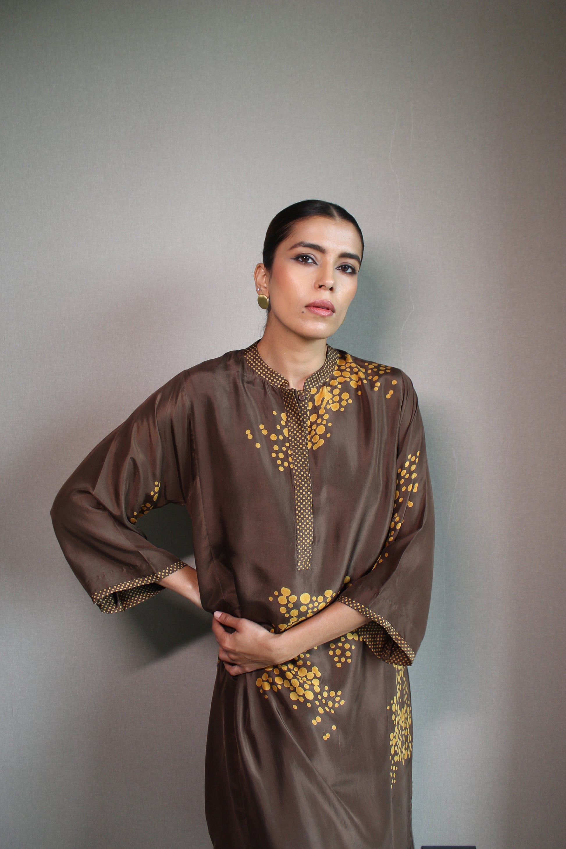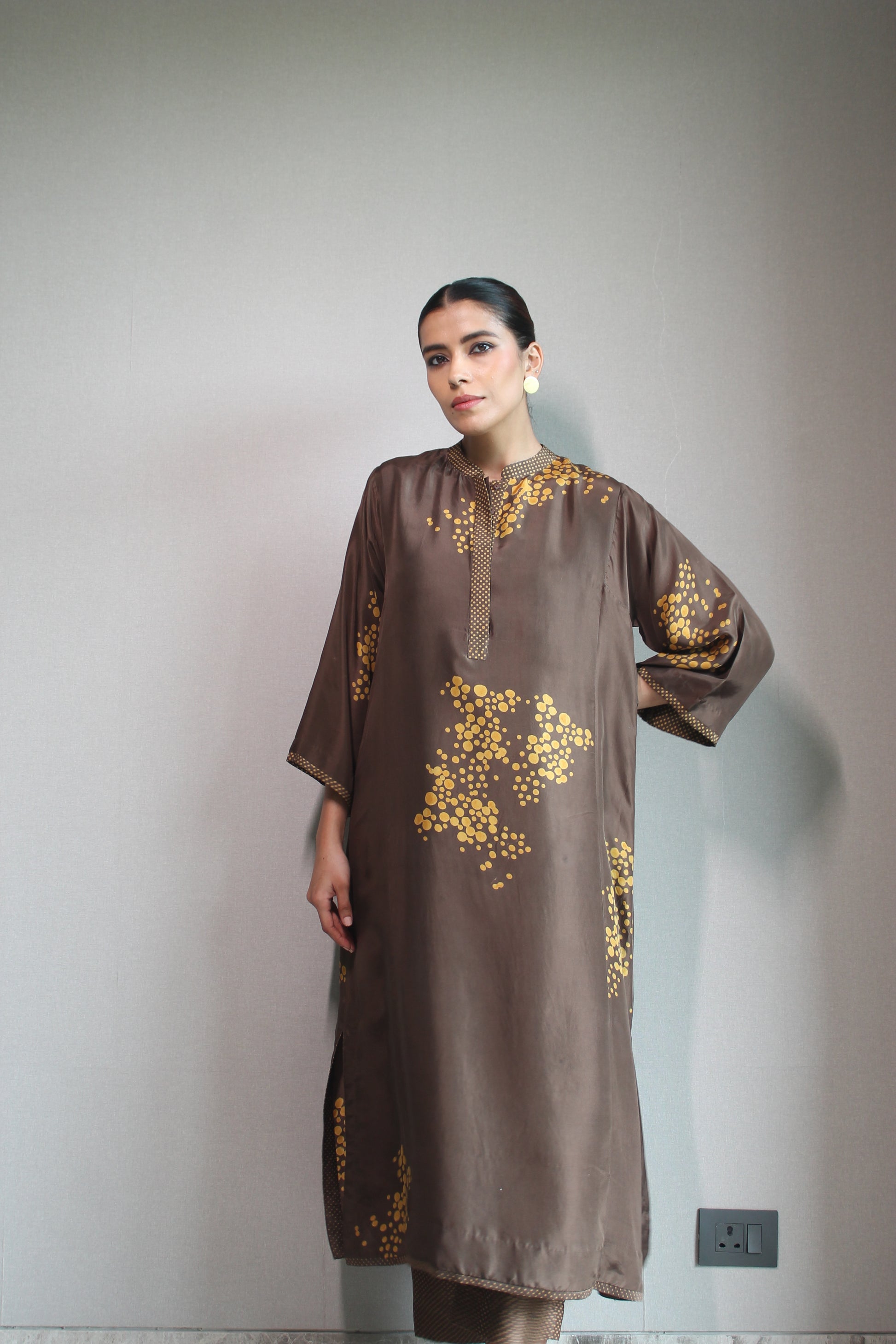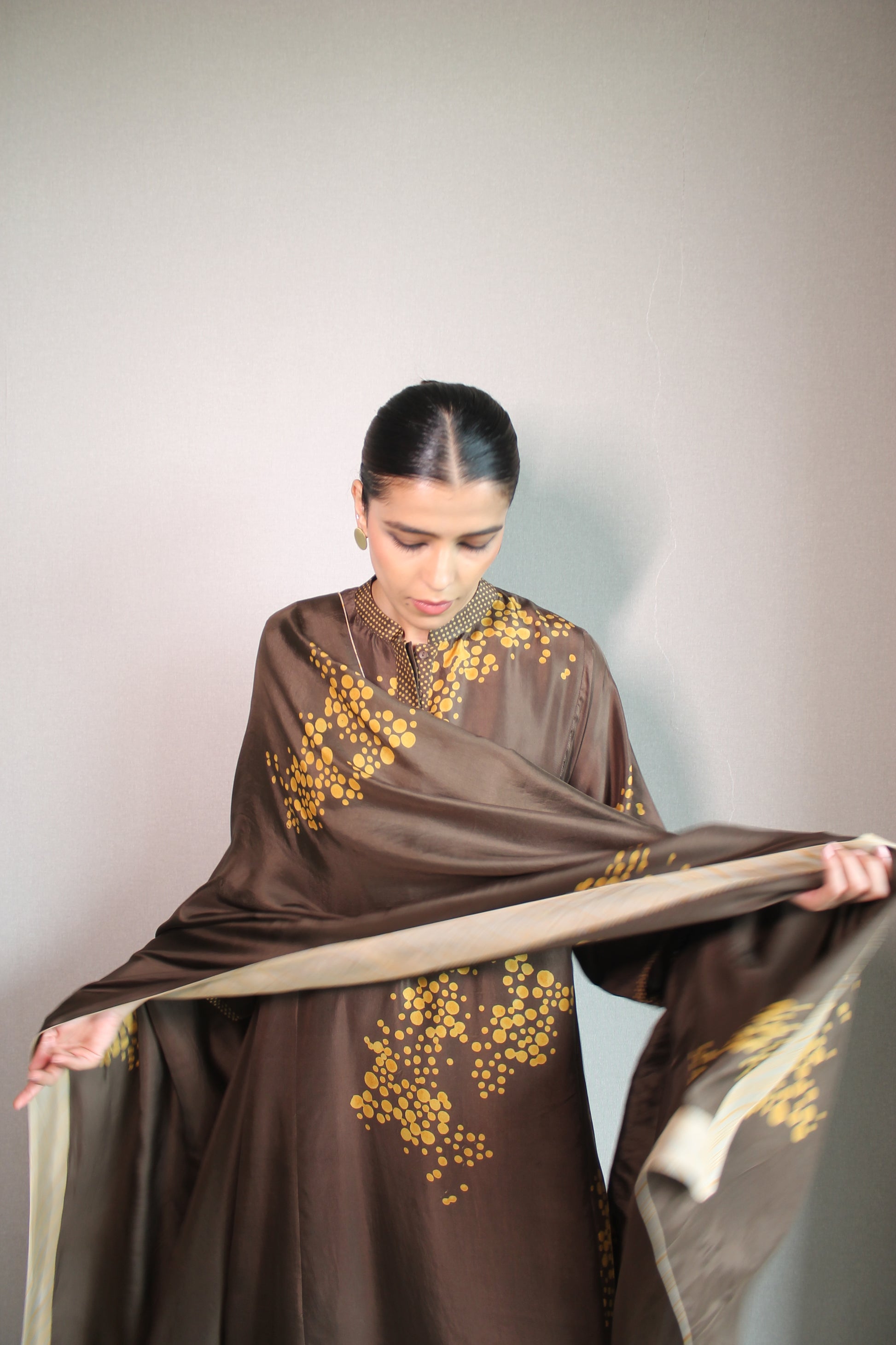 Kashmiri cut kurta in habutai silk with block print. Paired with a dupatta and dot block print trousers. Comes with a mulmul slip.