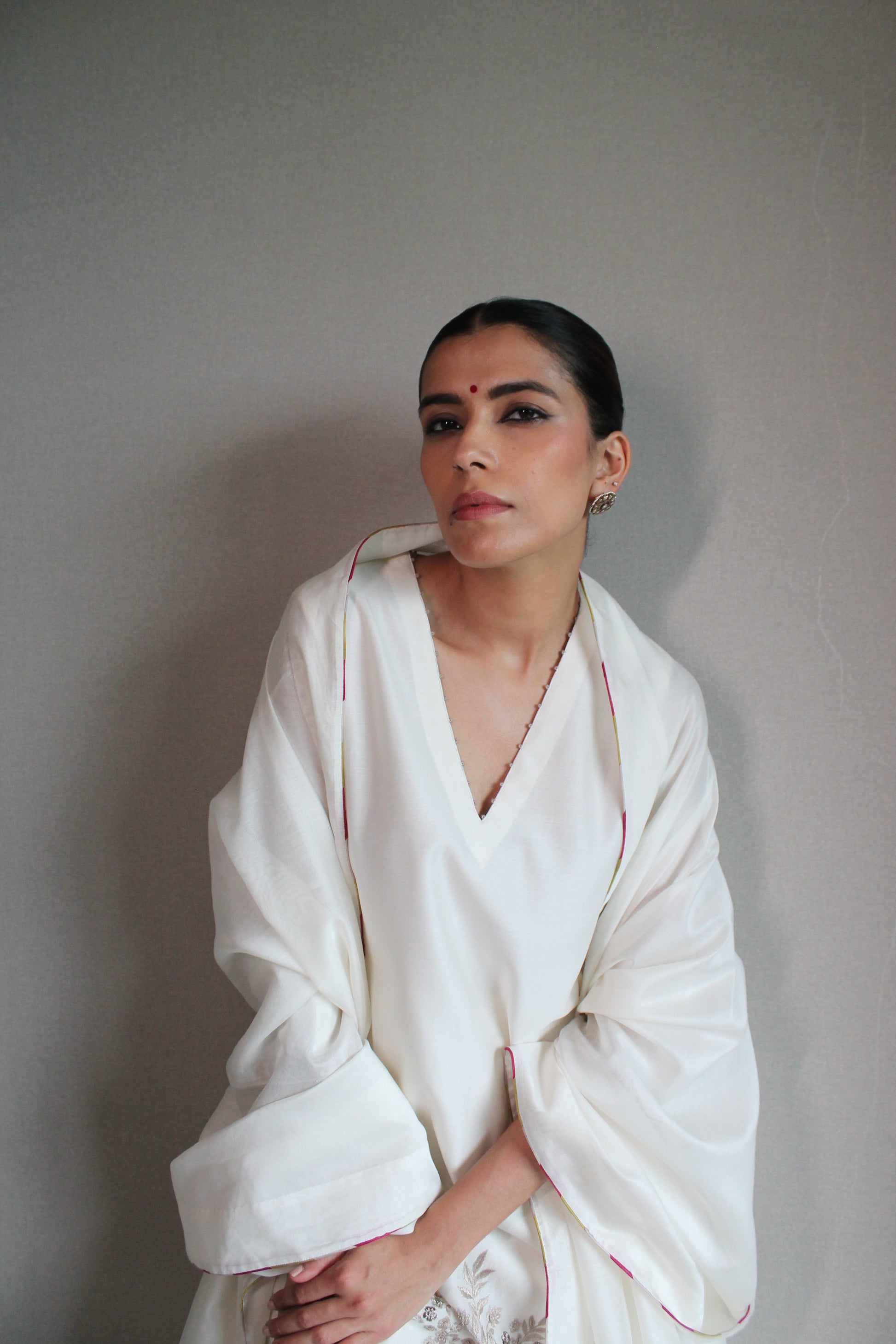 Straight cut kurta set in chanderi with hand embroidery. Paired with chanderi trousers and a dupatta with intricate hand embroidery.