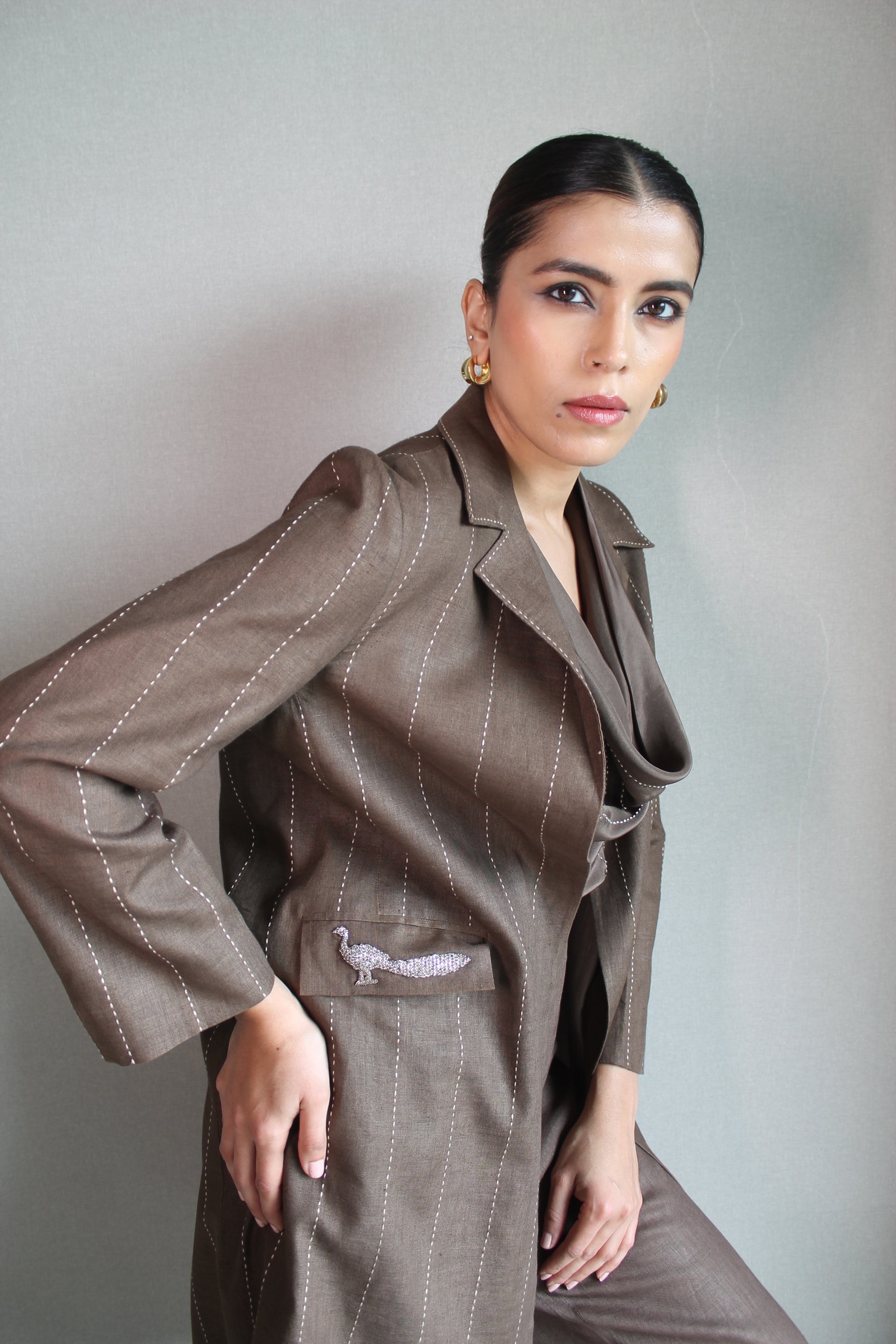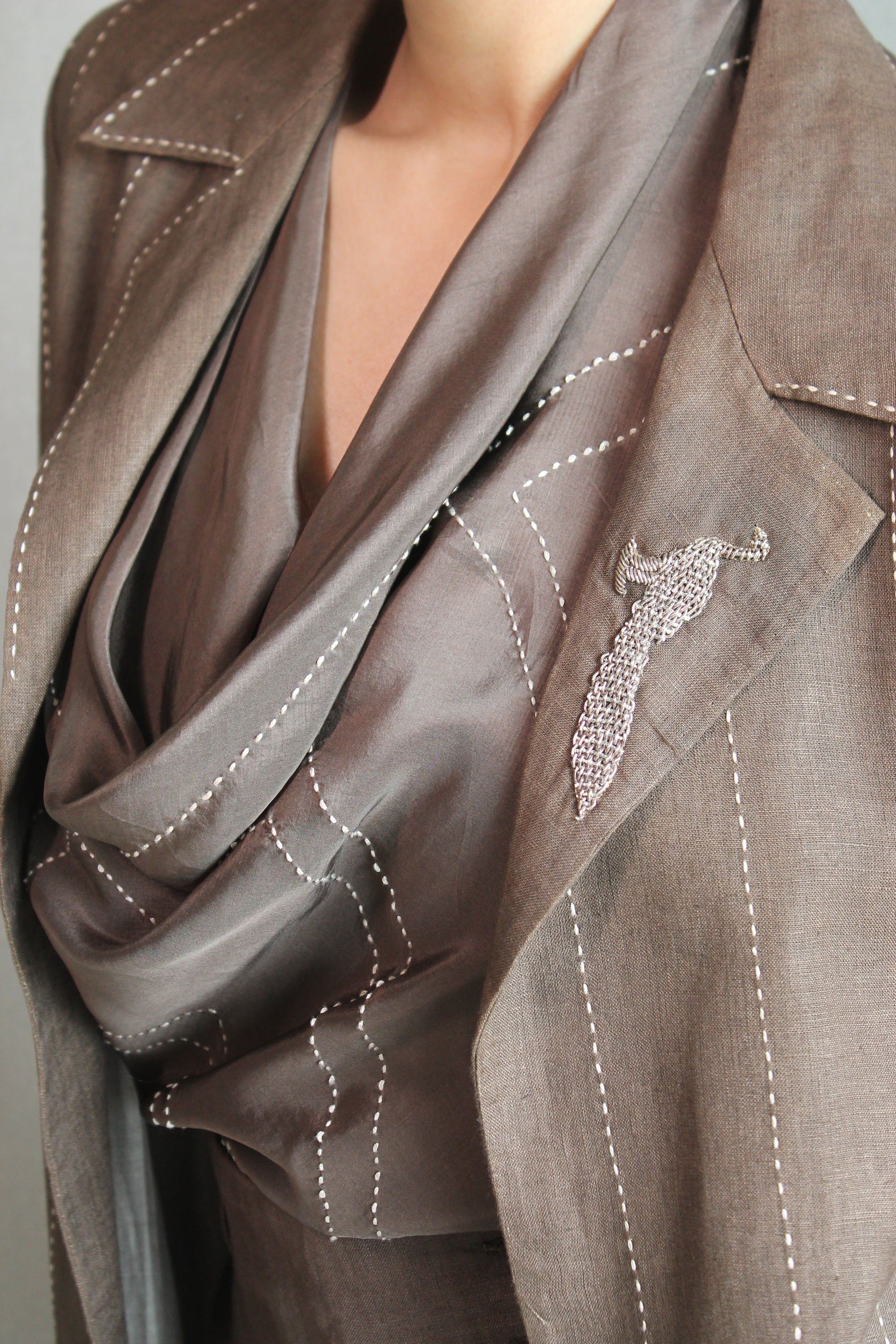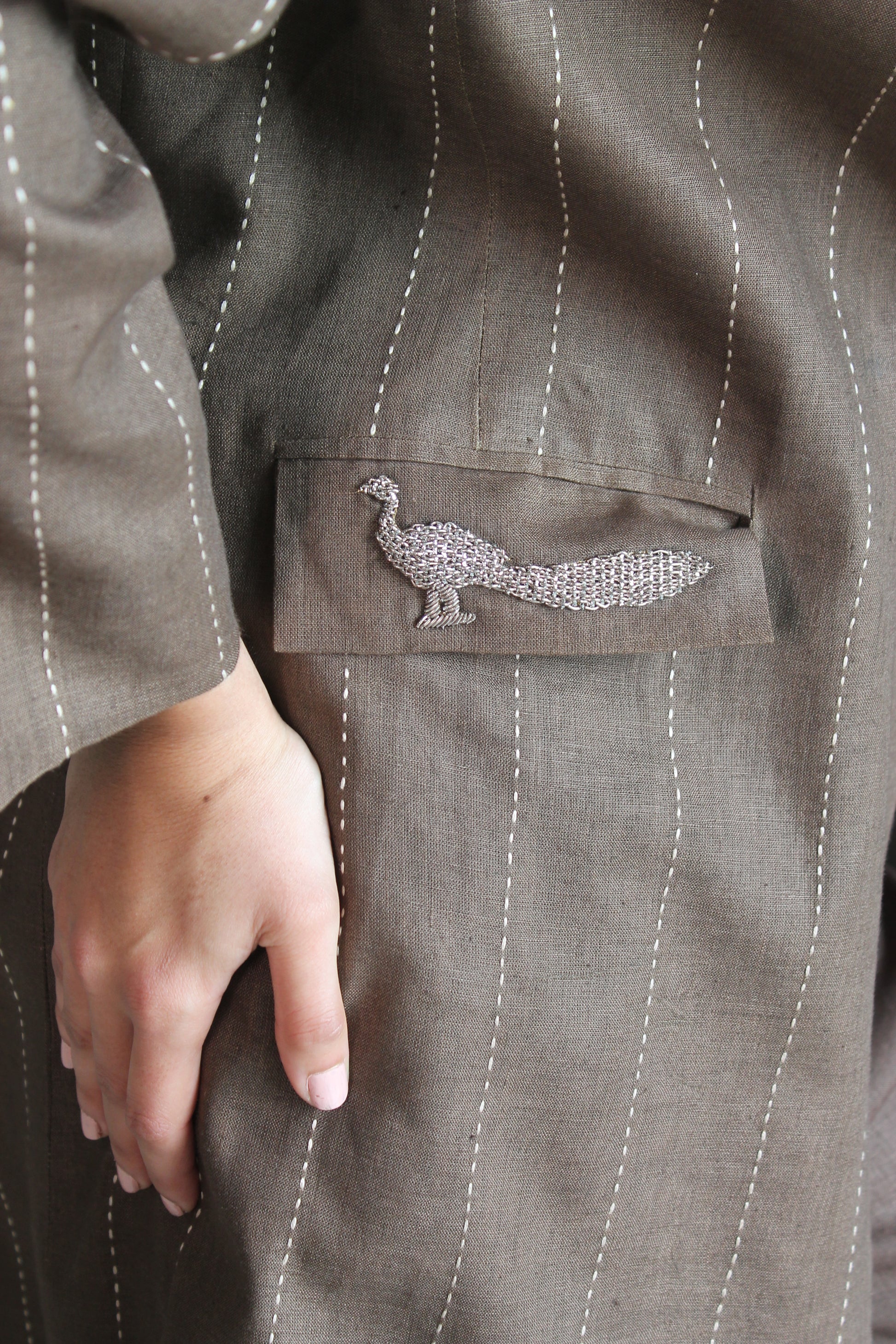 Irish linen a-line jacket with kantha hand embroidery and pockets.