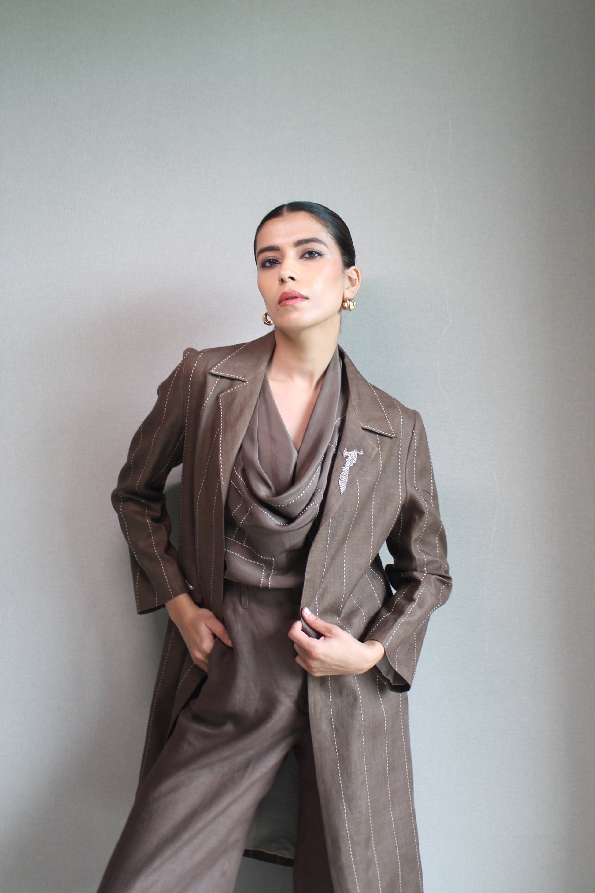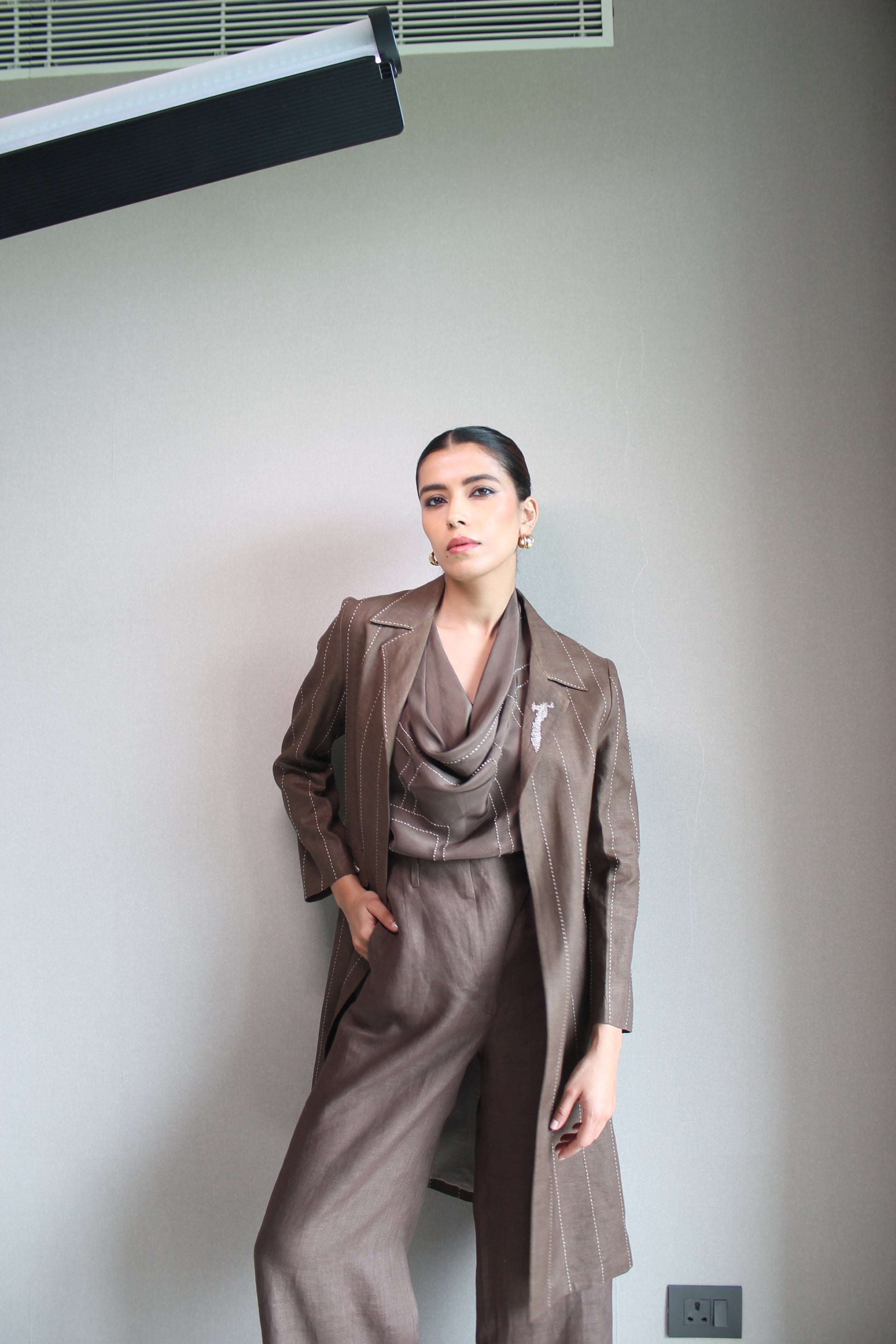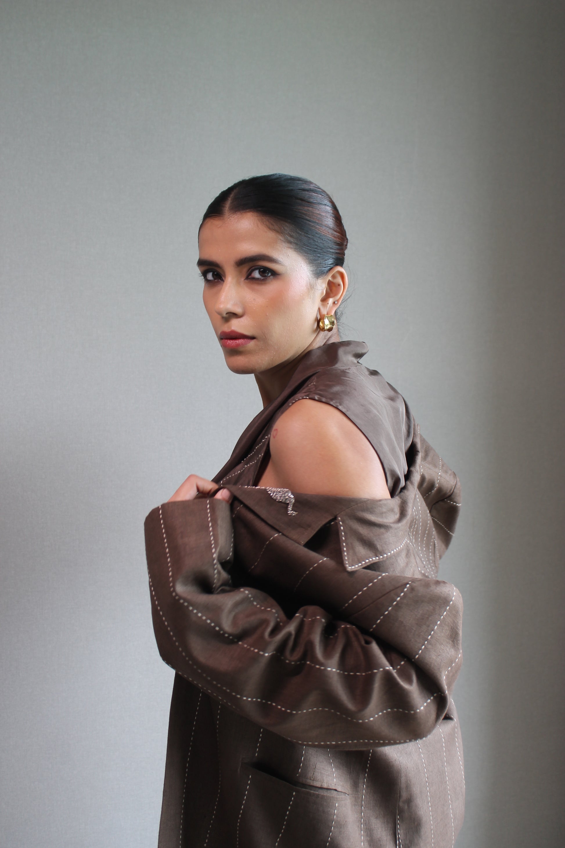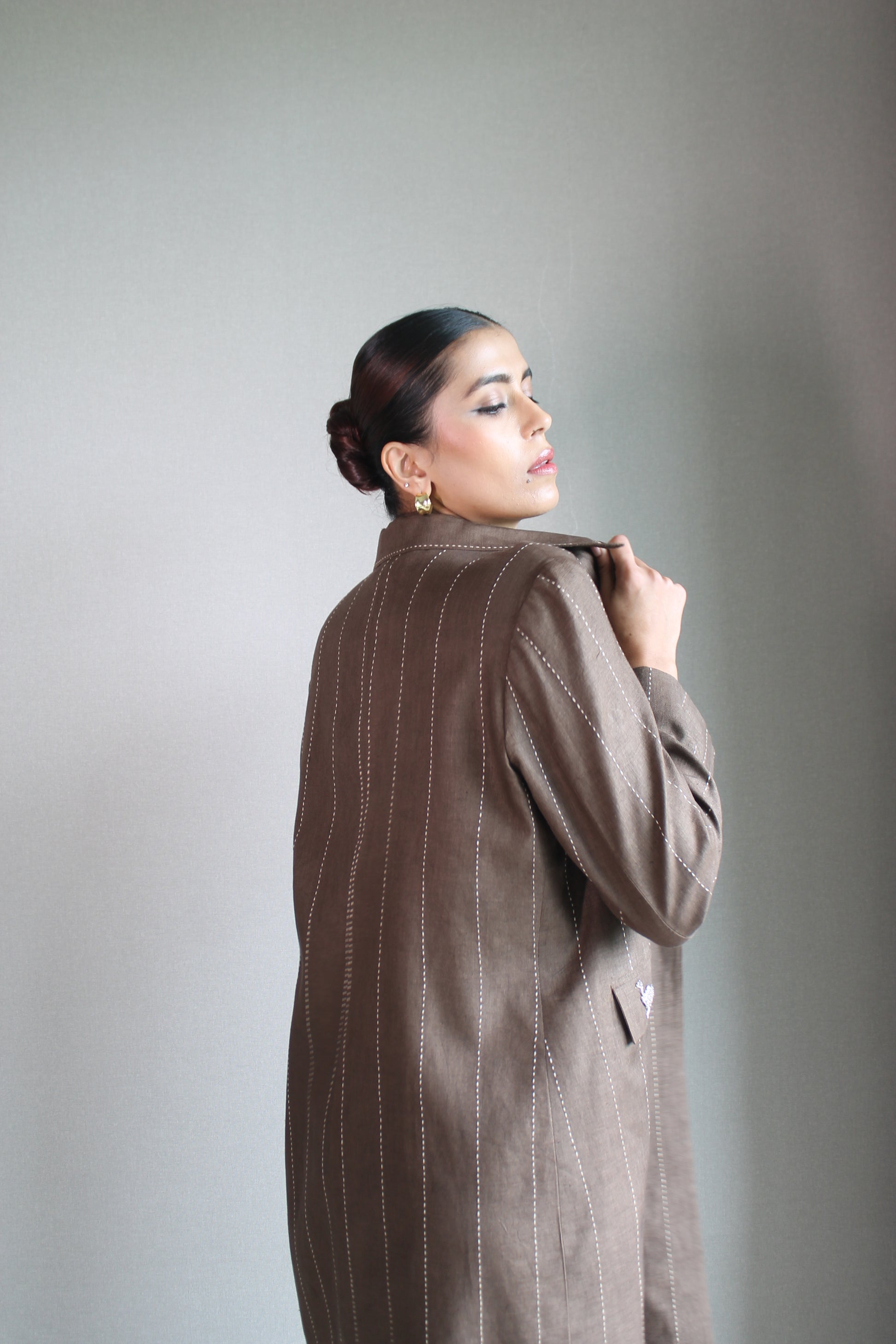 Irish linen a-line jacket with kantha hand embroidery and pockets.