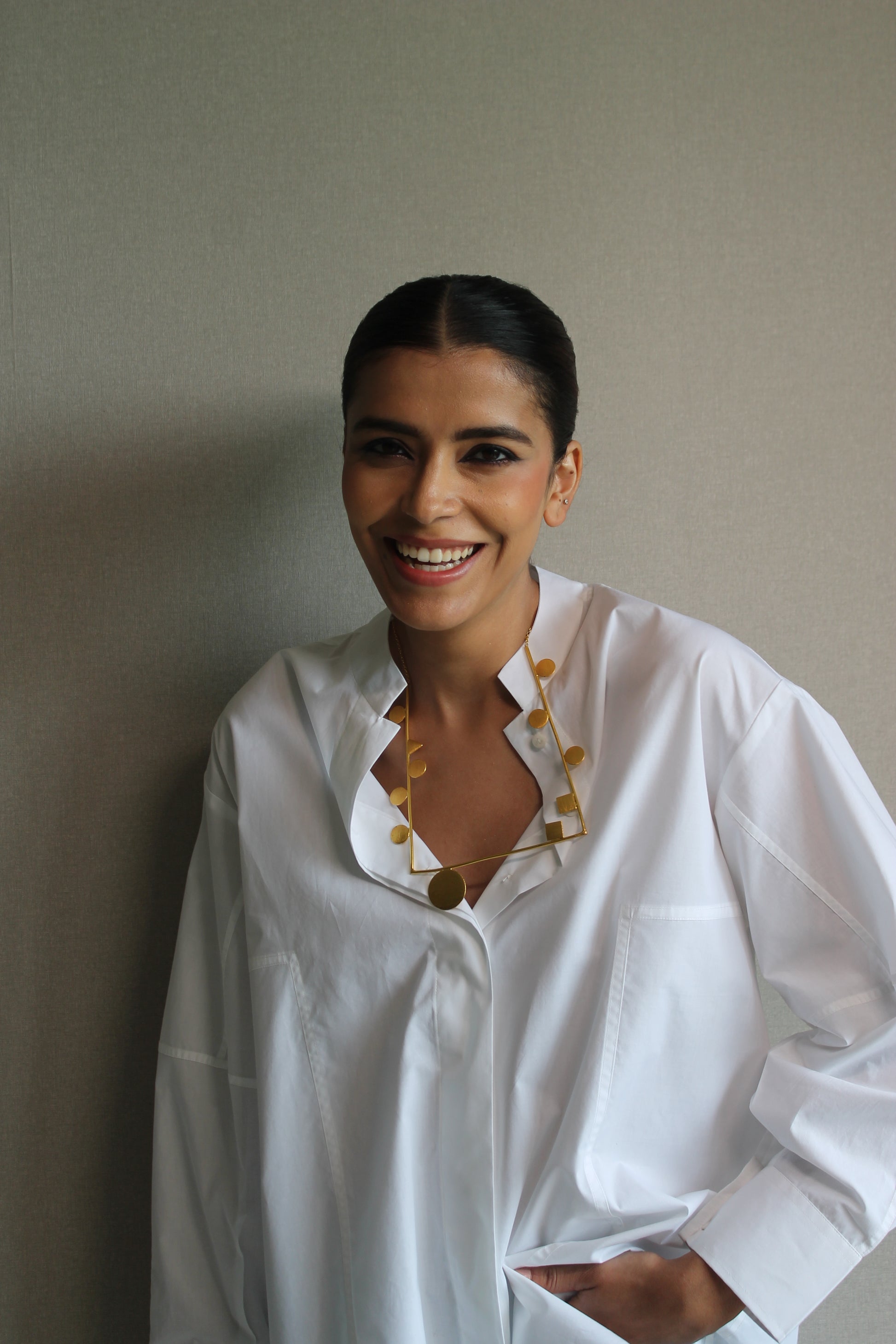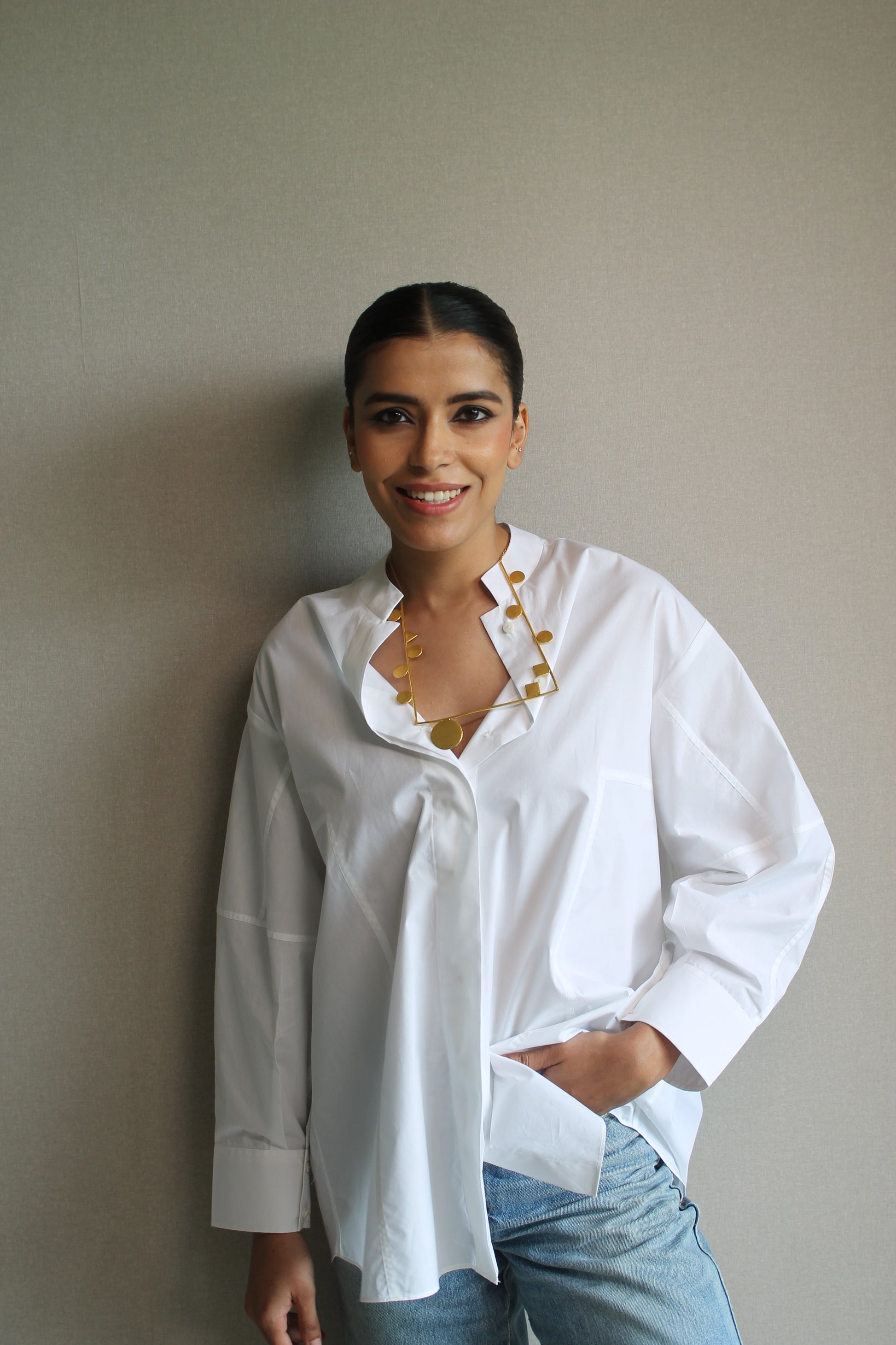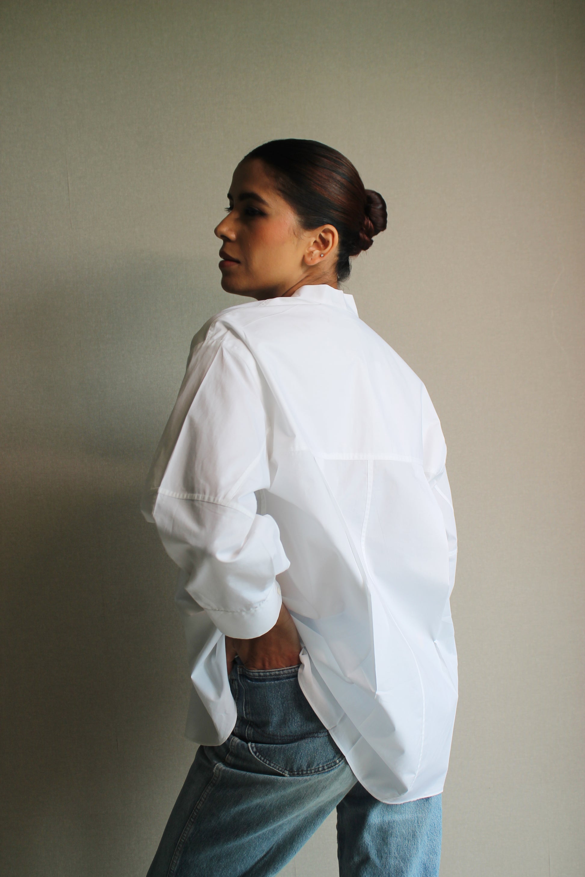 Poplin shirt with a mandarin collar and relaxed drop armhole fit.