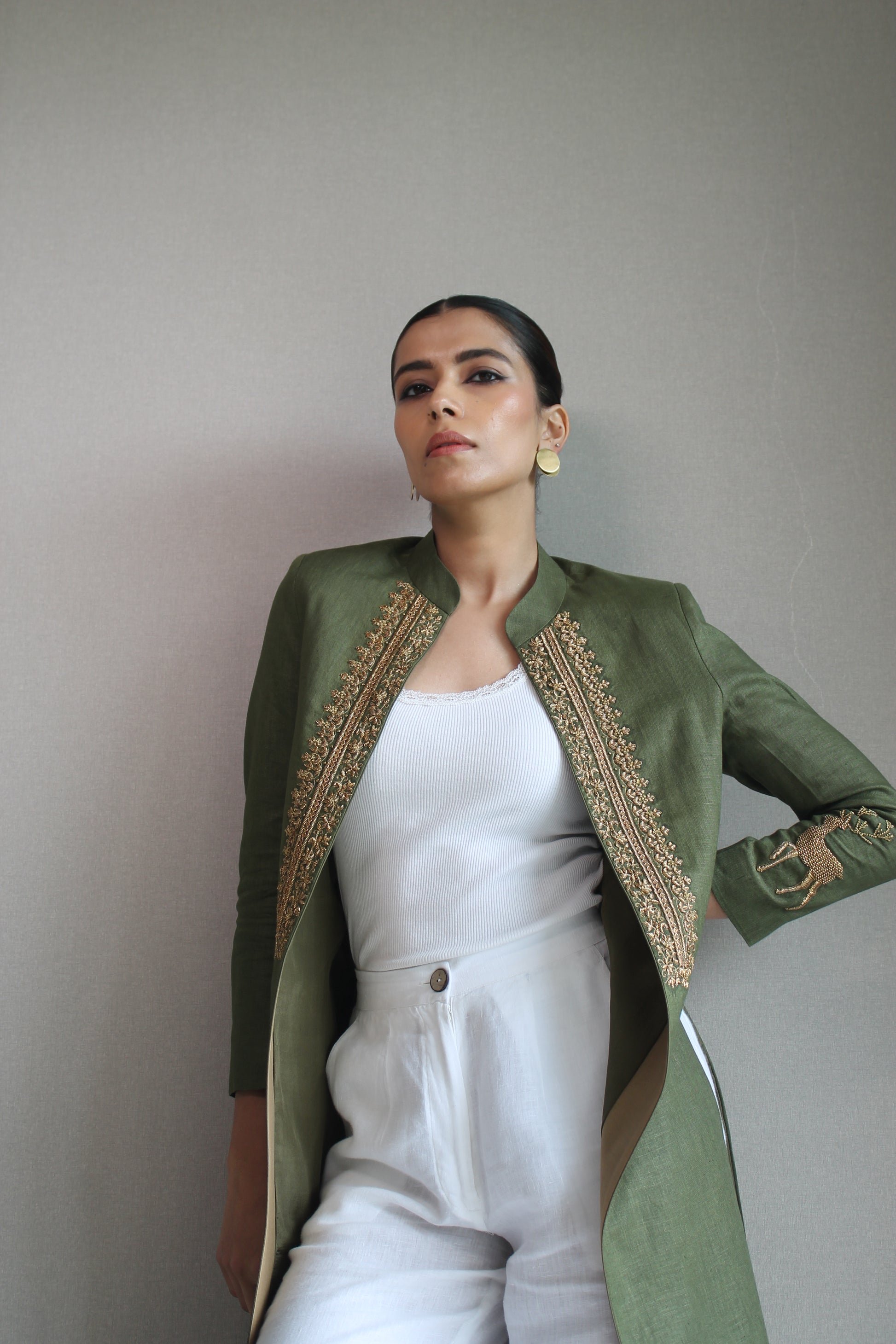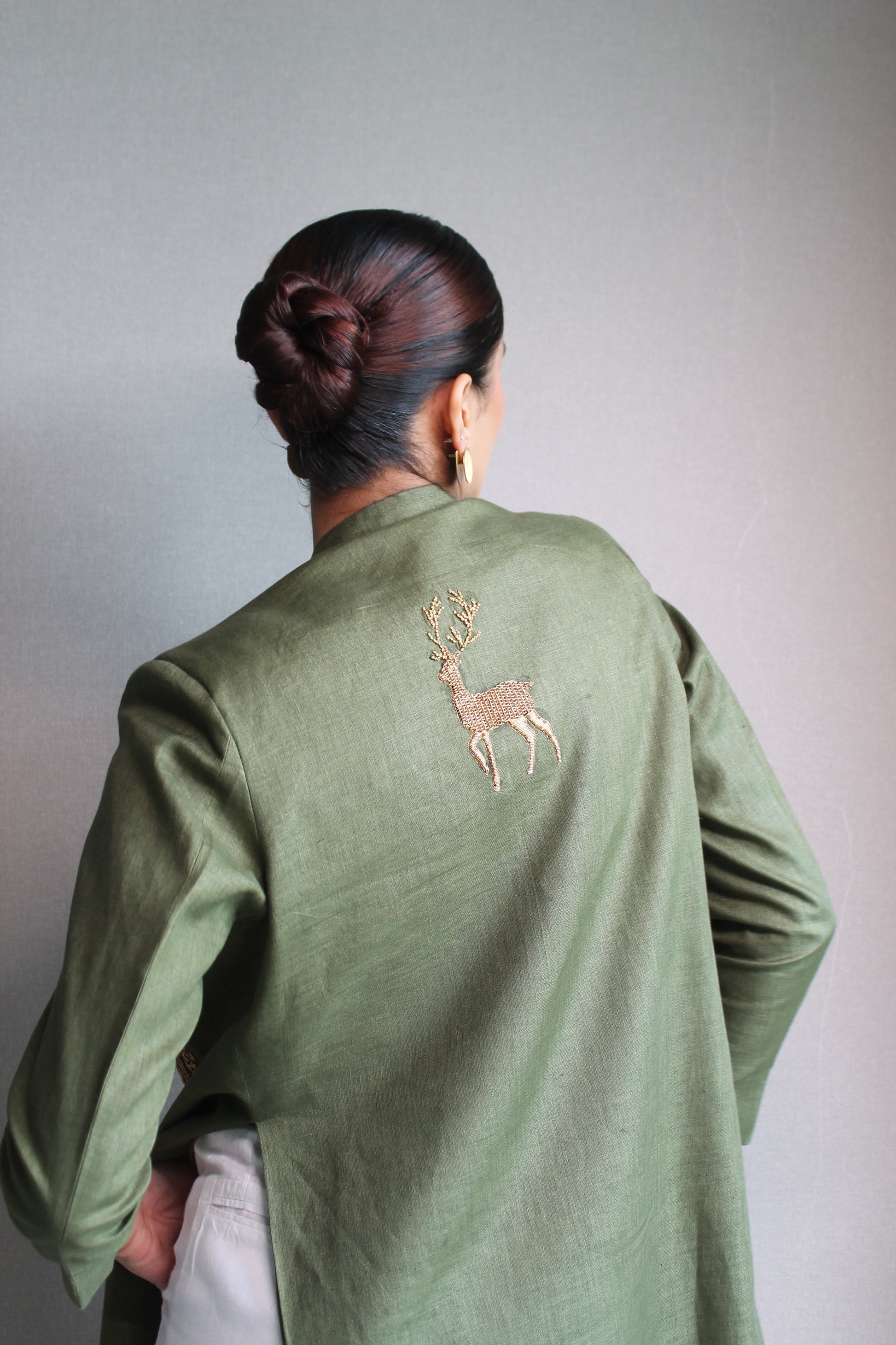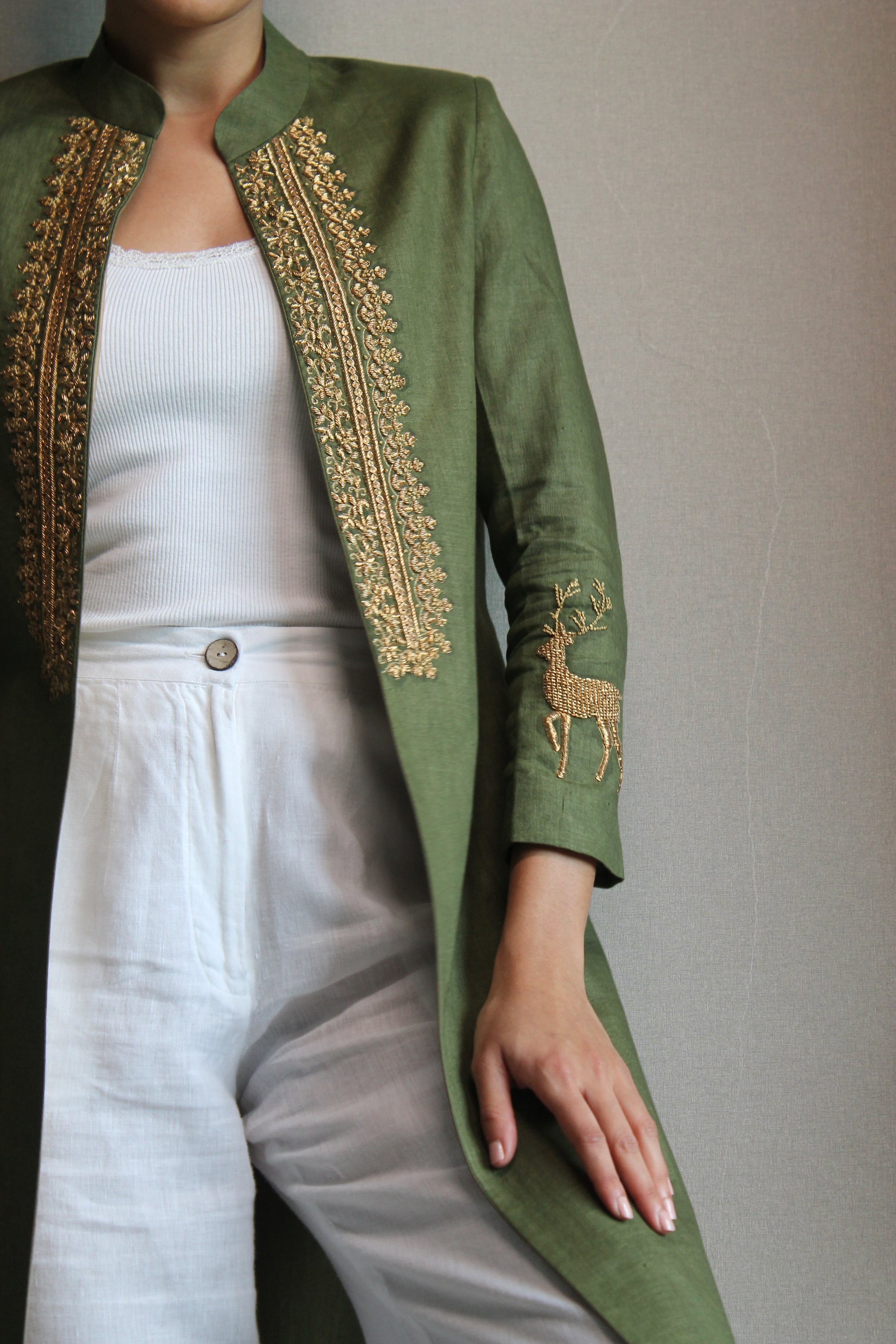 Irish linen jacket with hand embroidery and a mandarin collar.