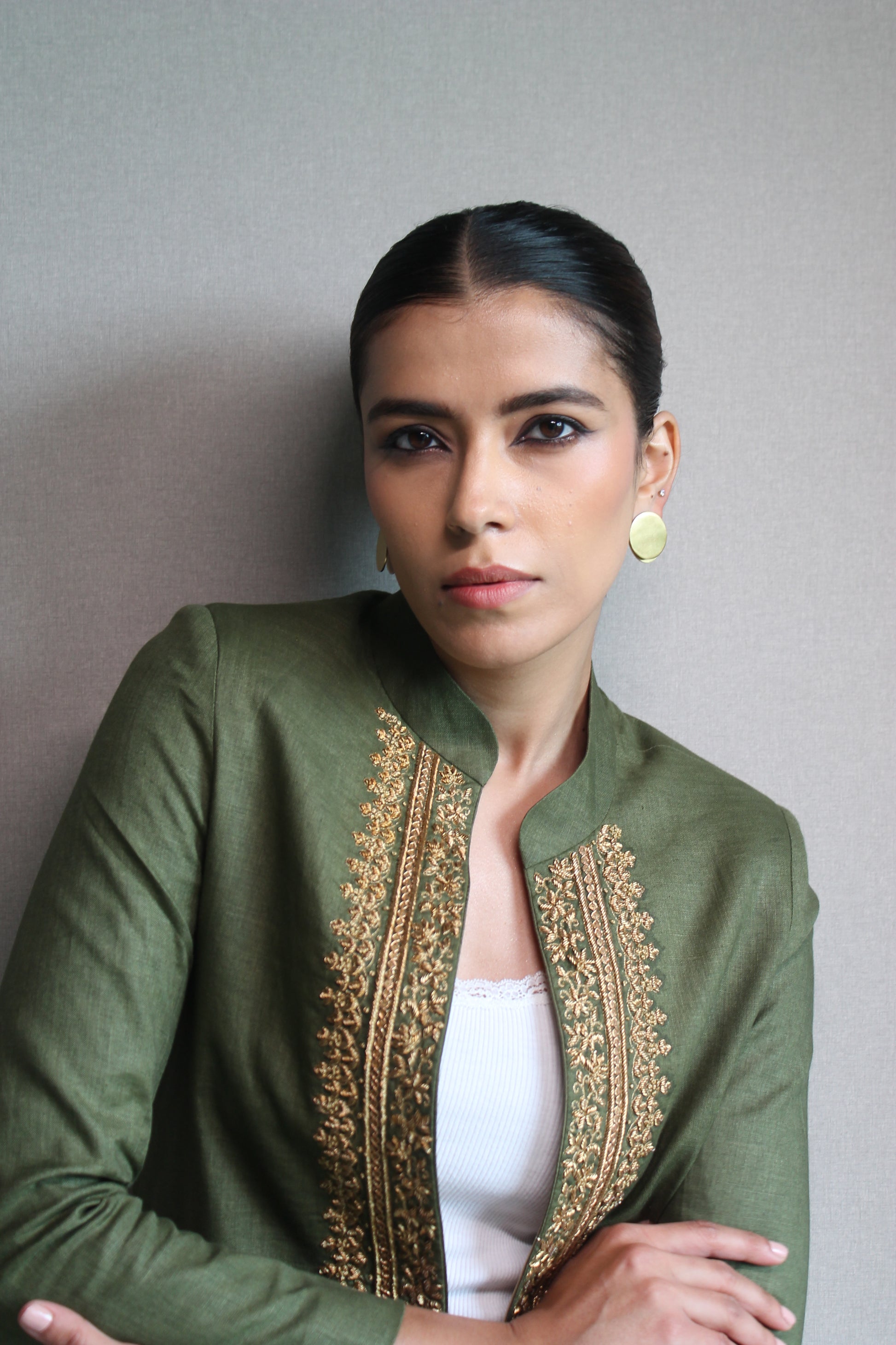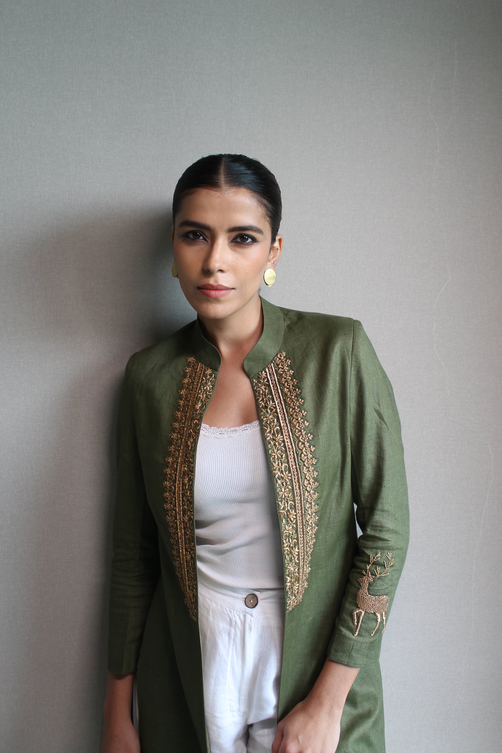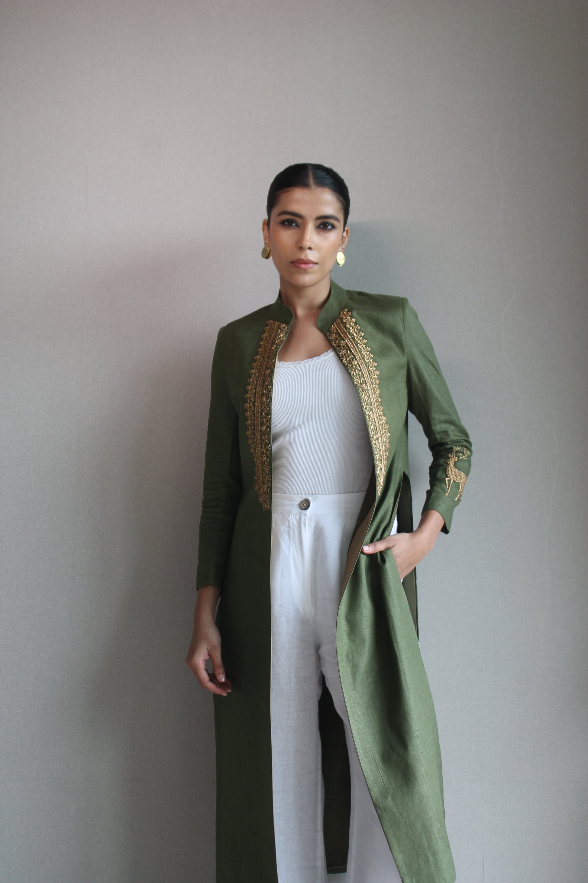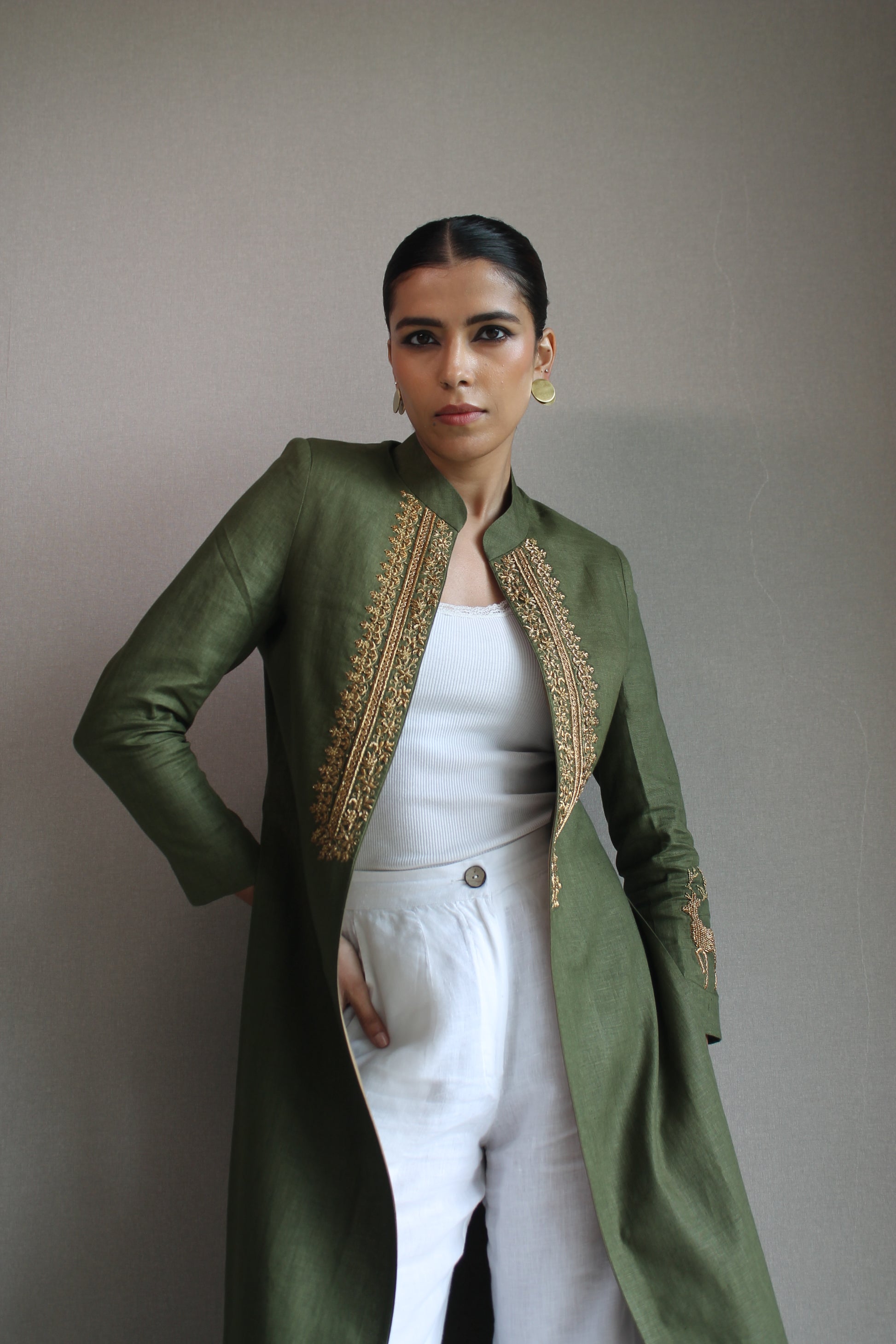 Irish linen jacket with hand embroidery and a mandarin collar.