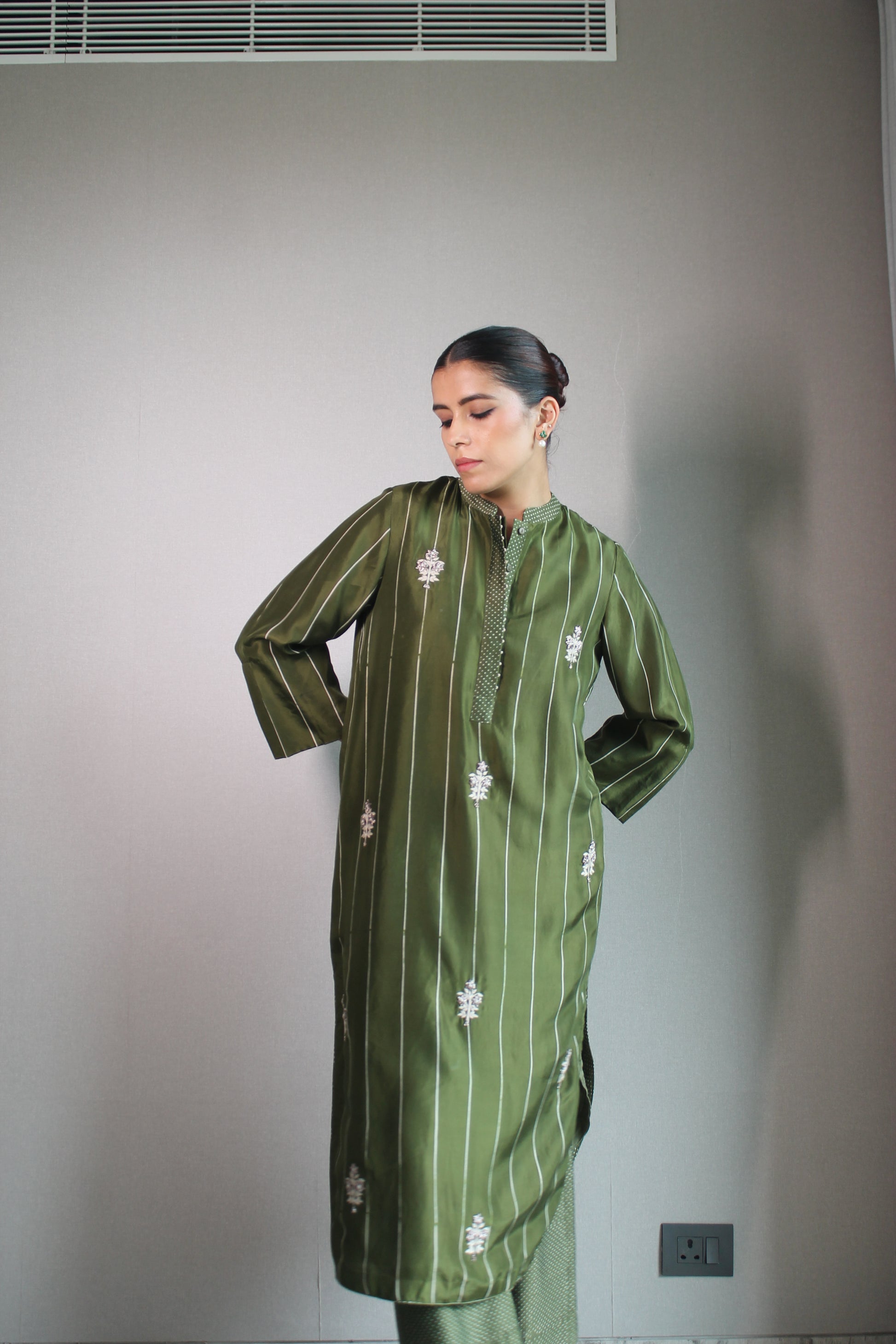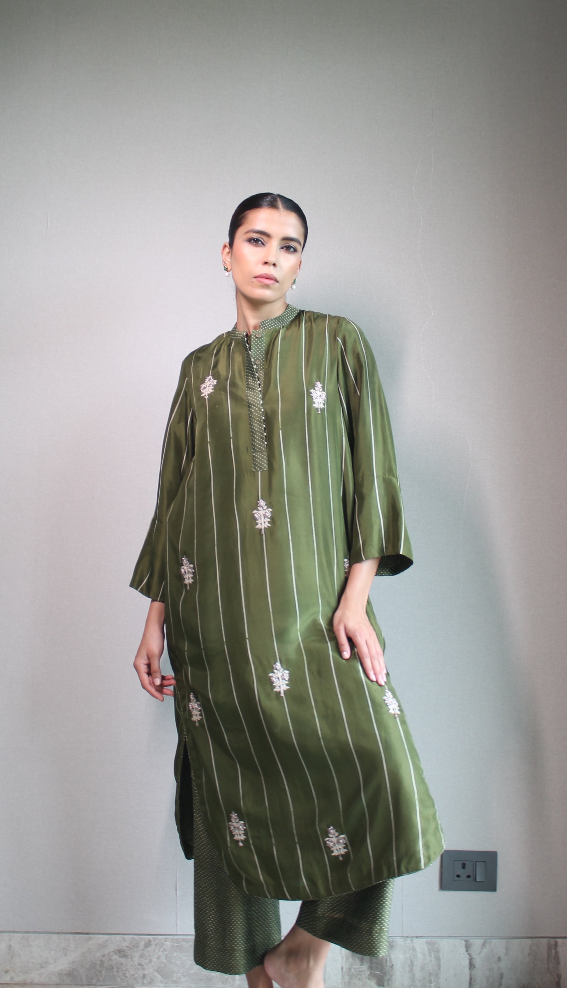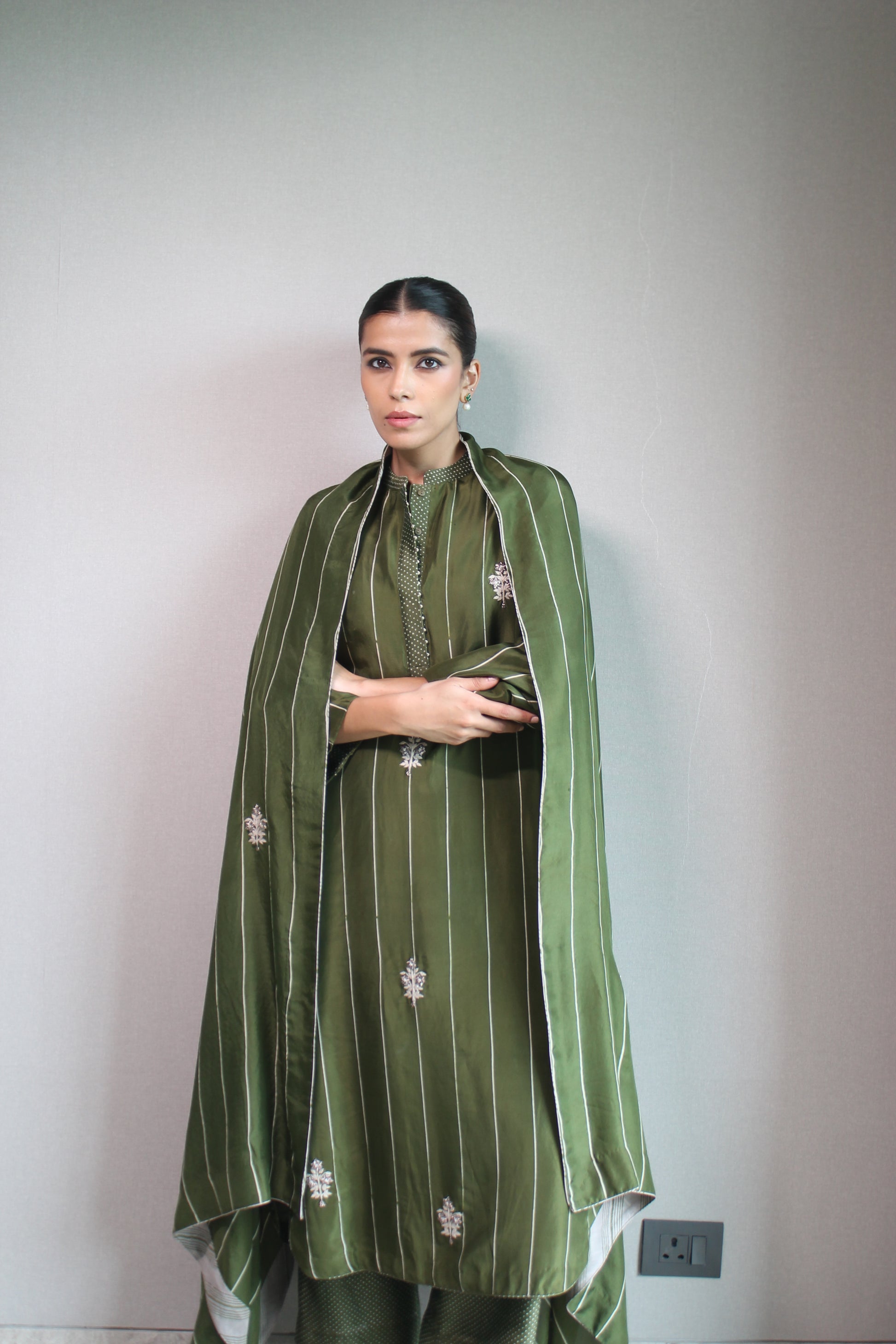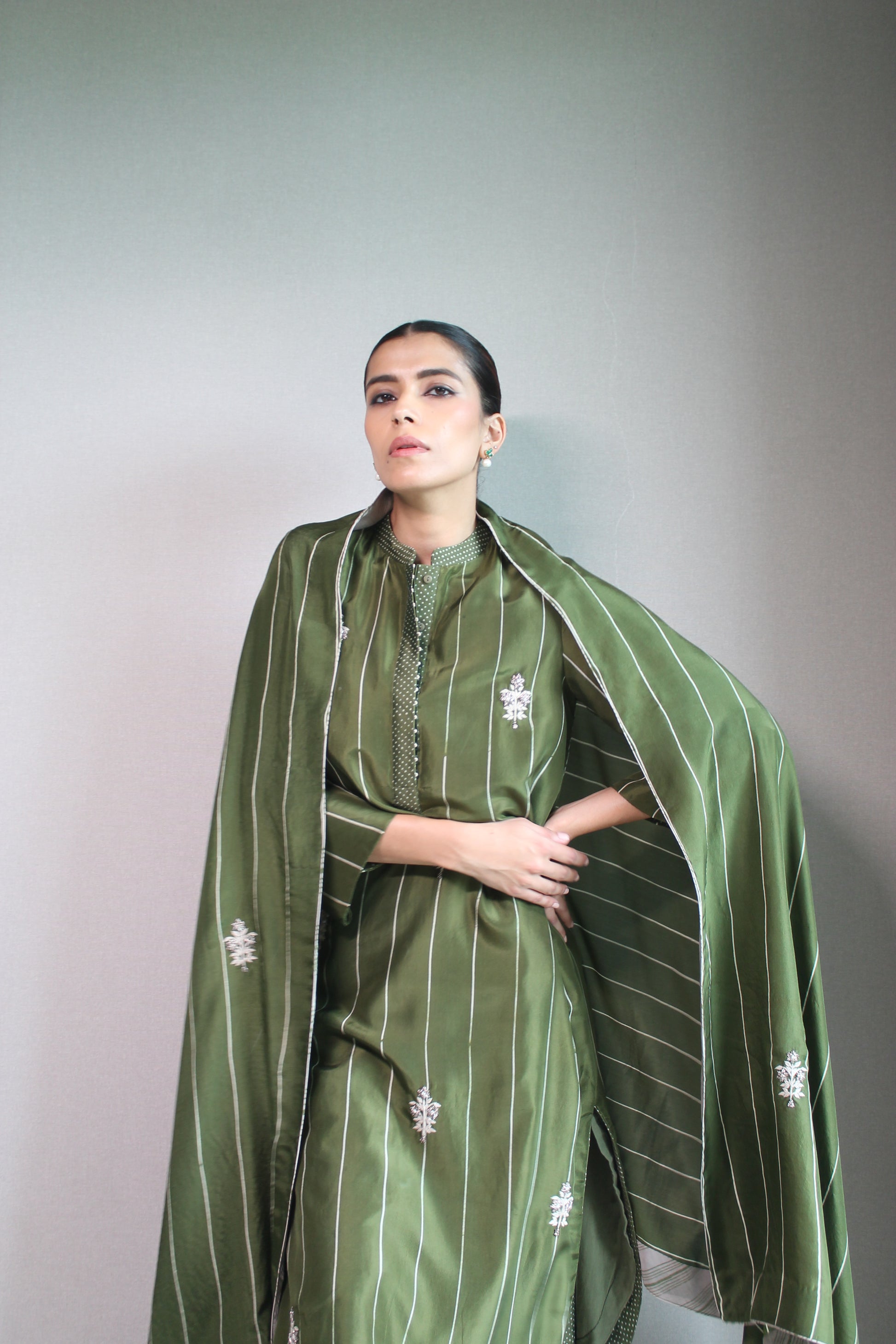 Straight cut habutai silk kurta with block print, hand embroidery, and rounded edges. Paired with a hand embroidered block print dupatta and trousers.