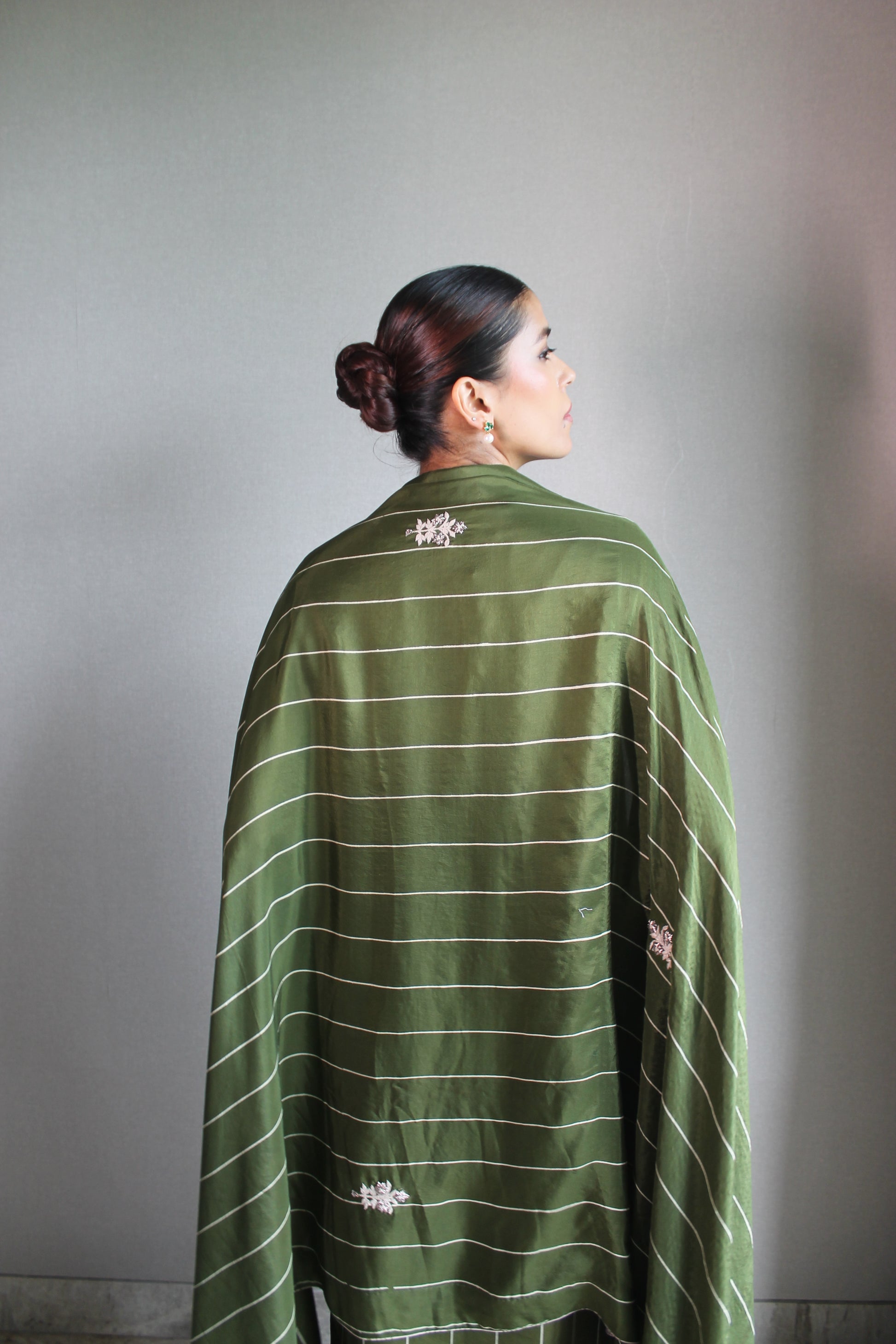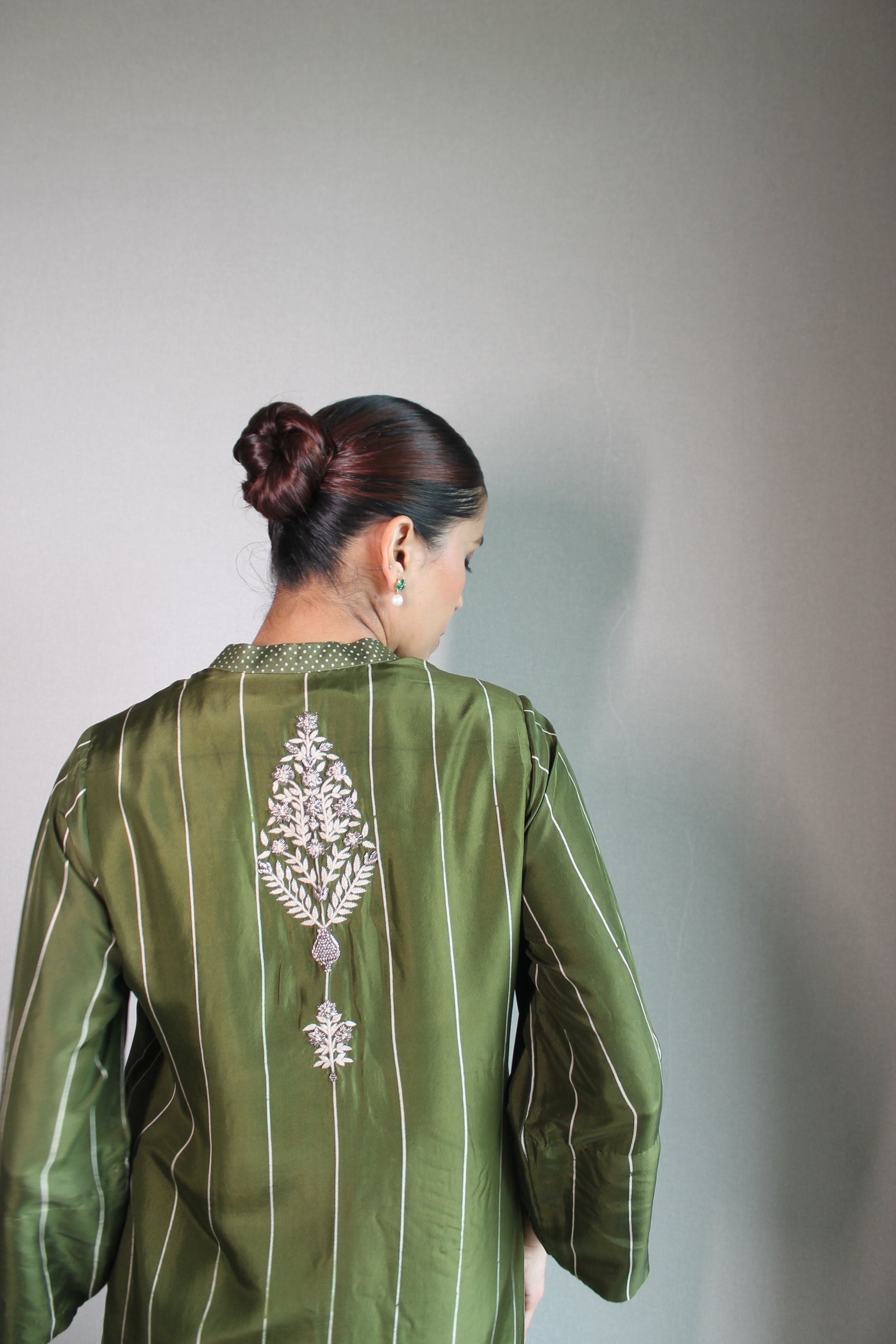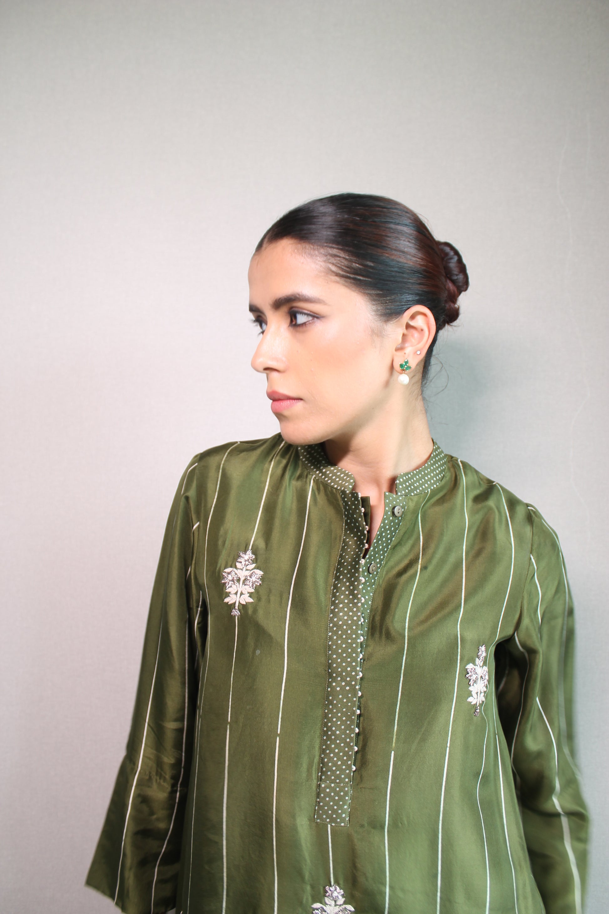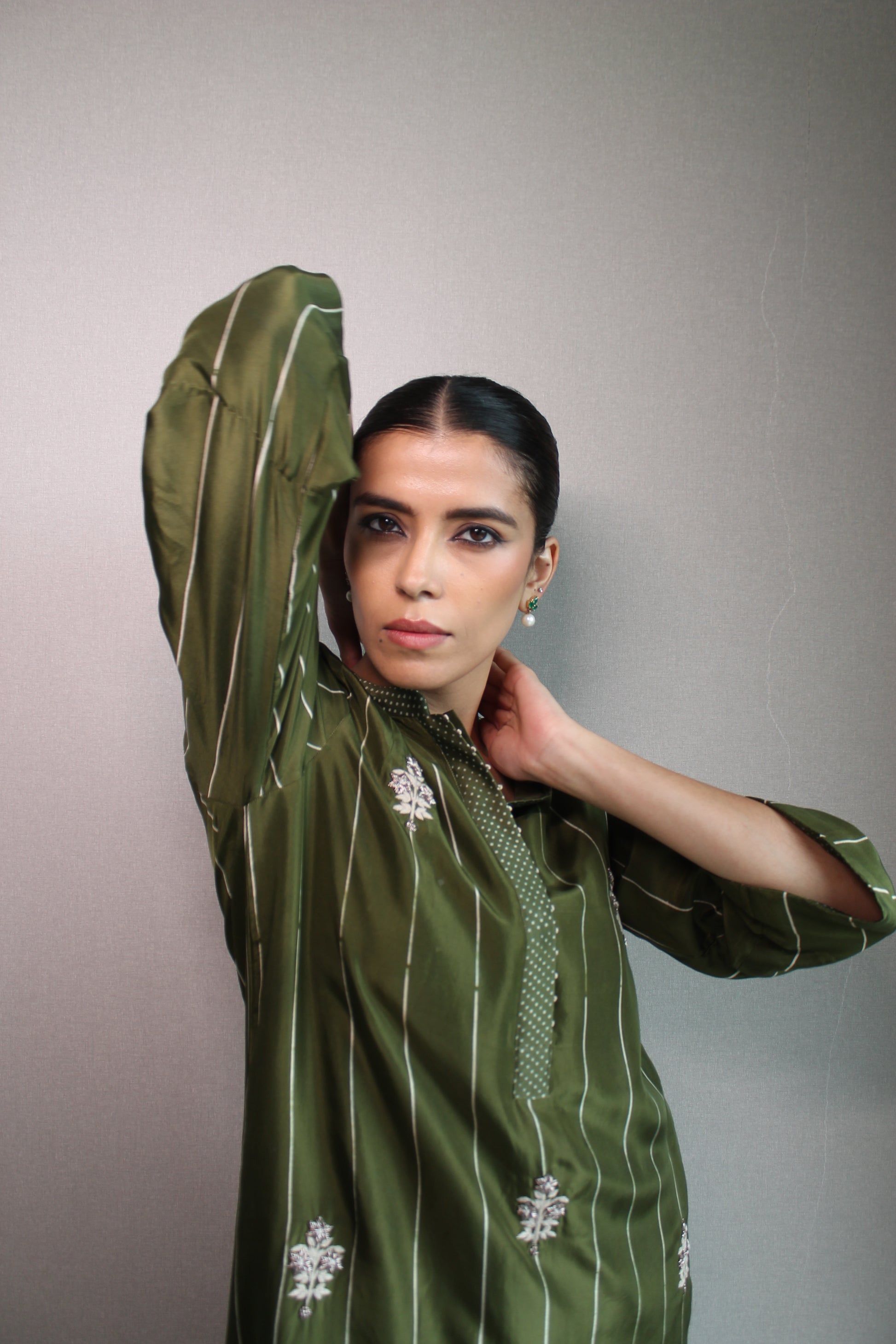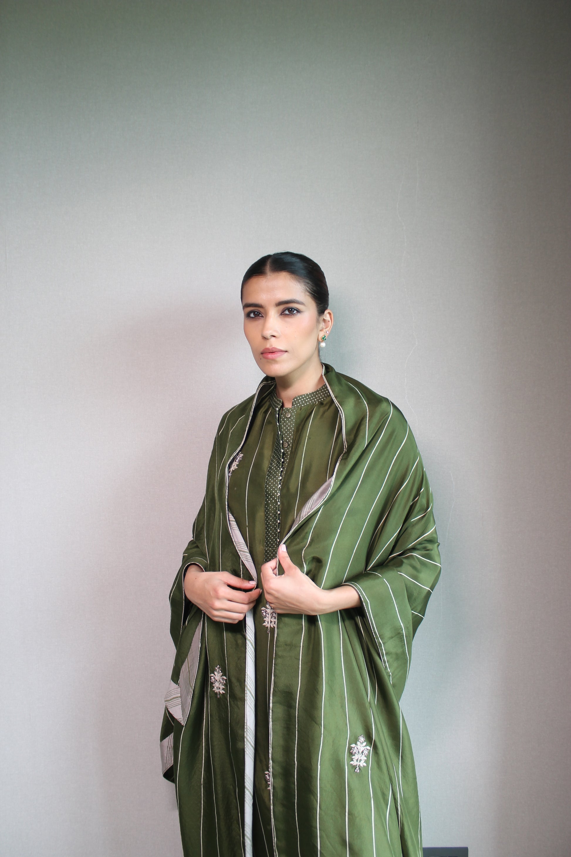Straight cut habutai silk kurta with block print, hand embroidery, and rounded edges. Paired with a hand embroidered block print dupatta and trousers.