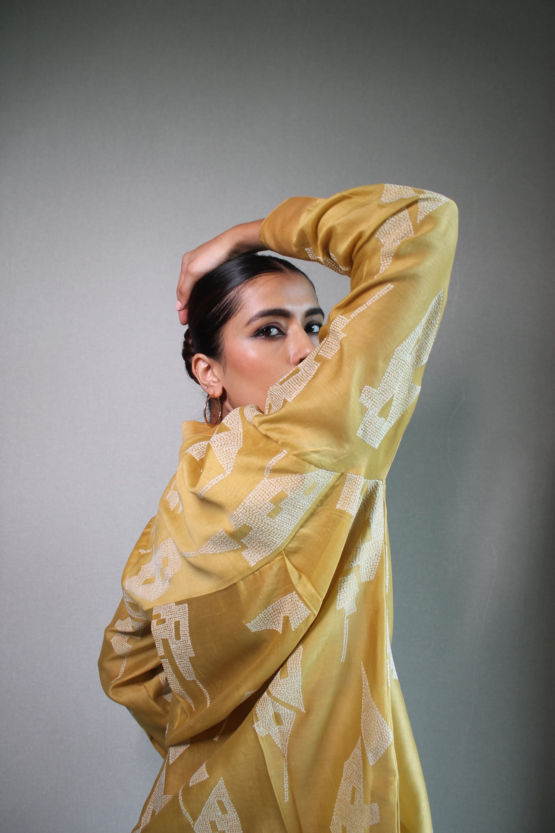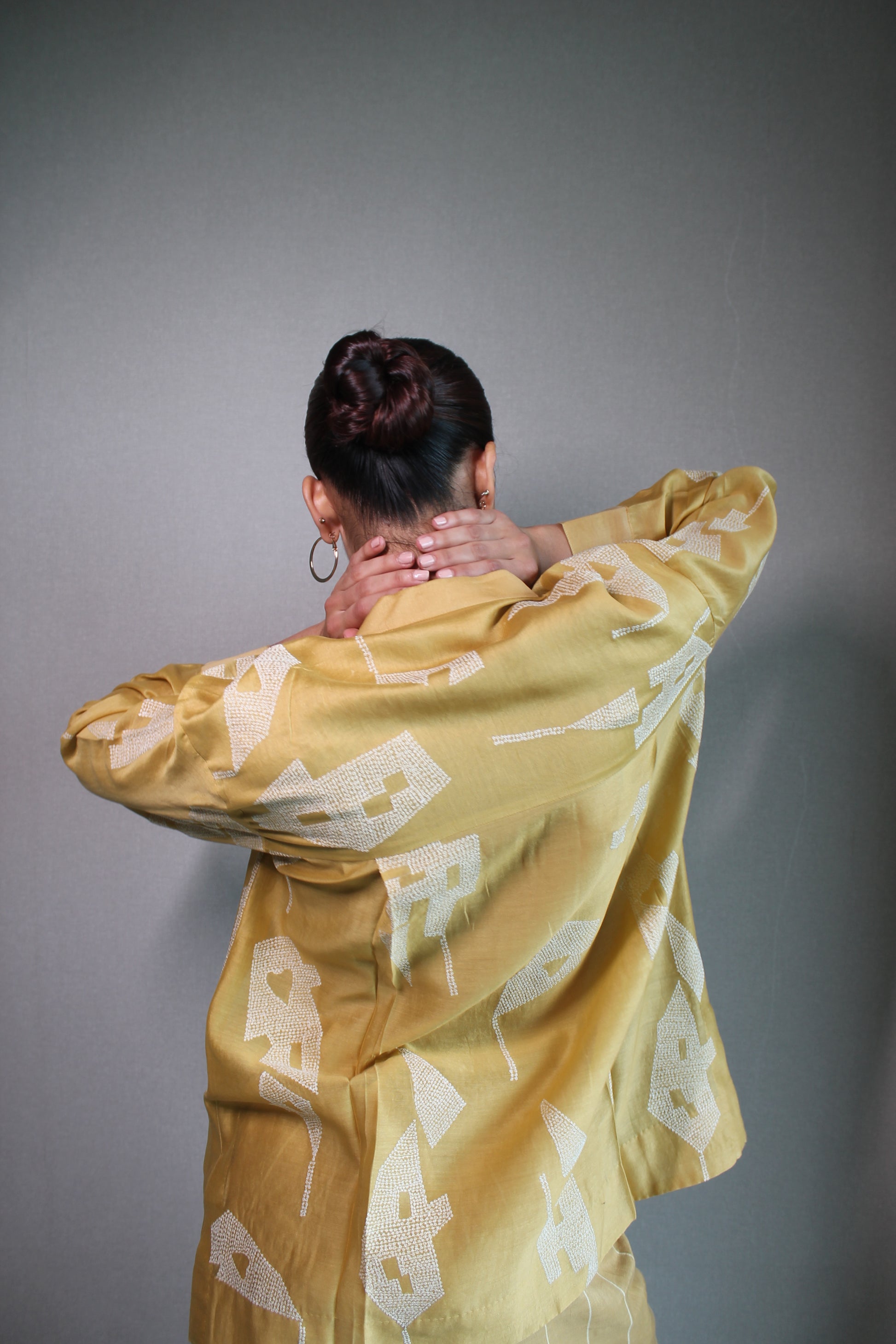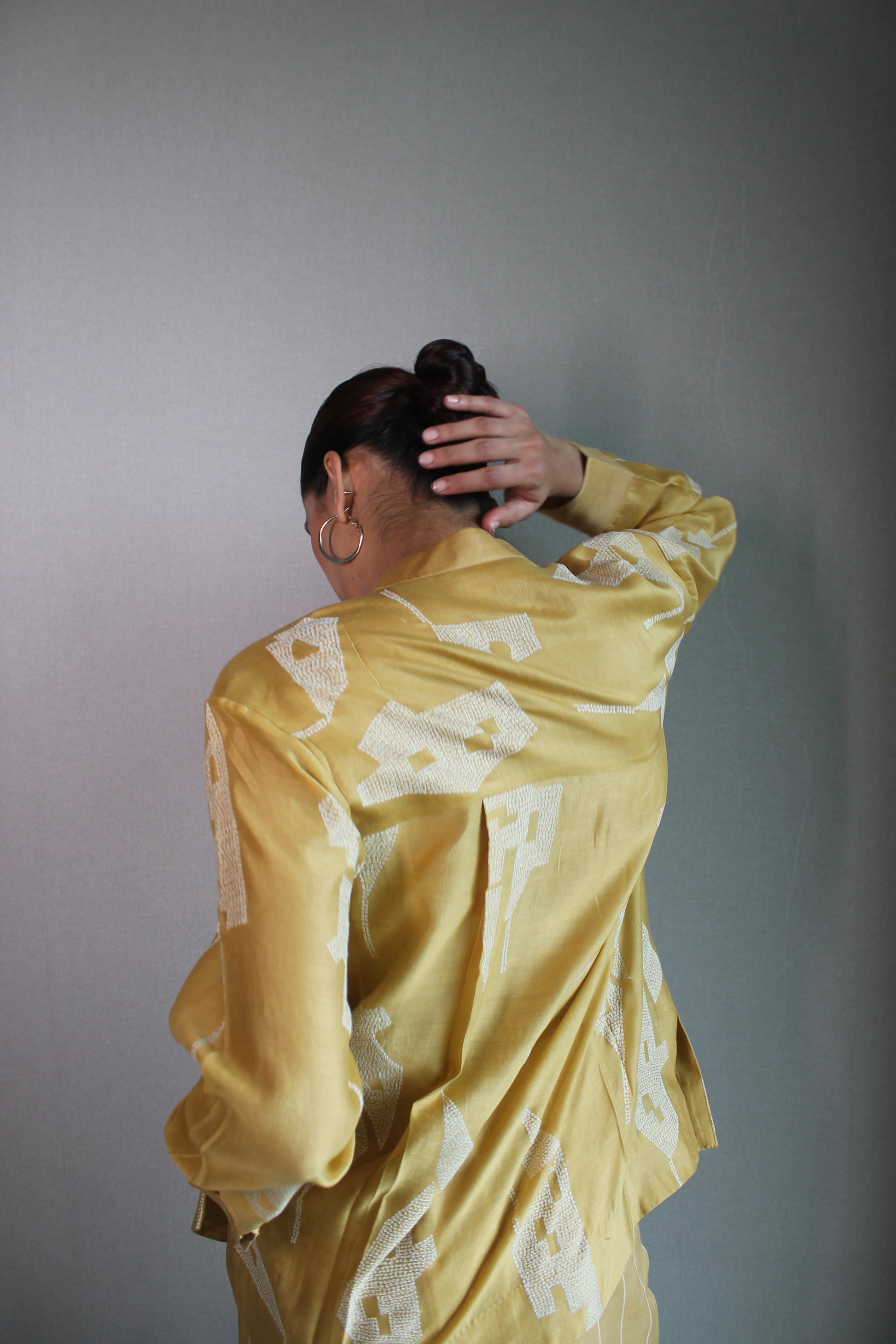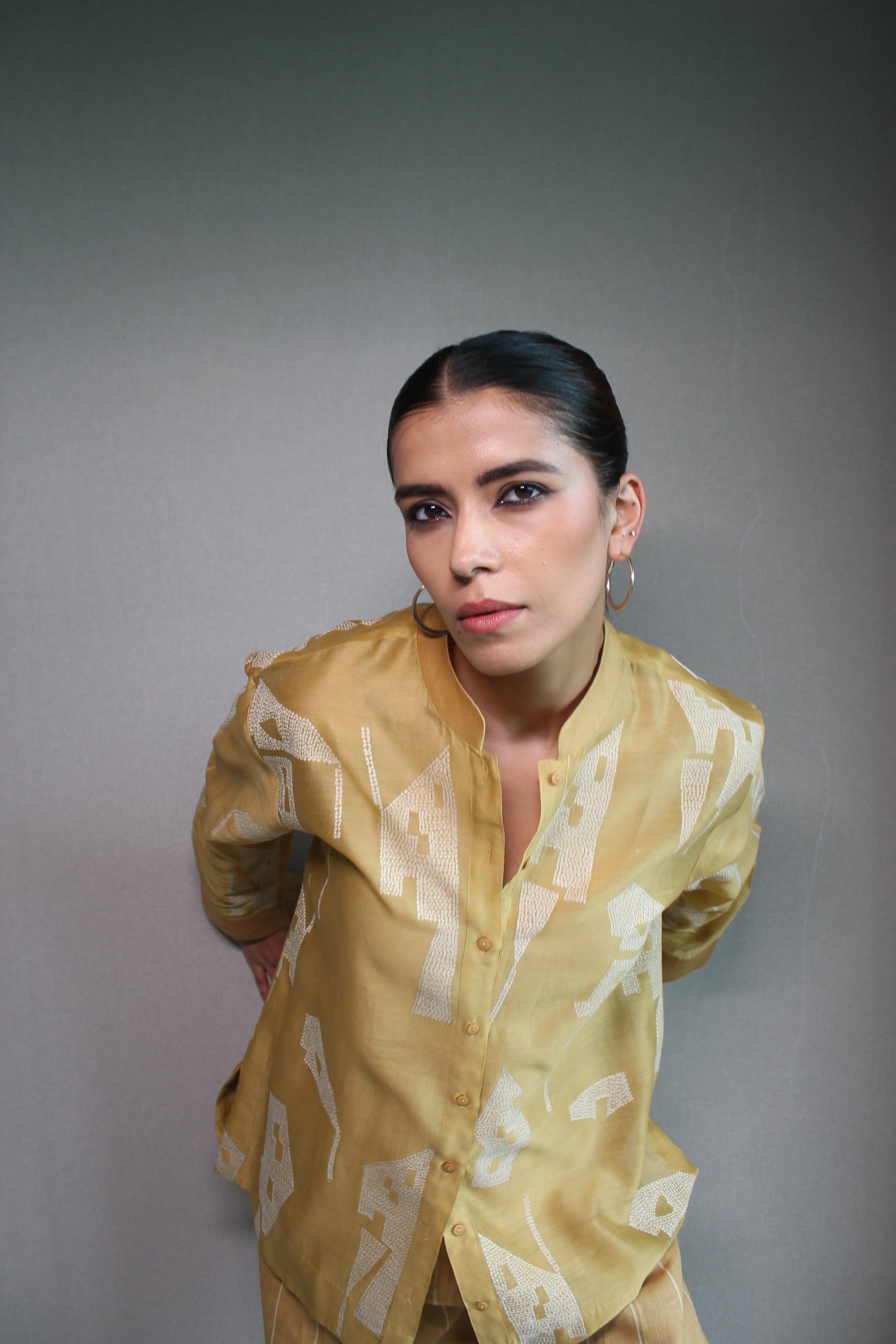 Chanderi shirt with machine embroidery and a mandarin collar.